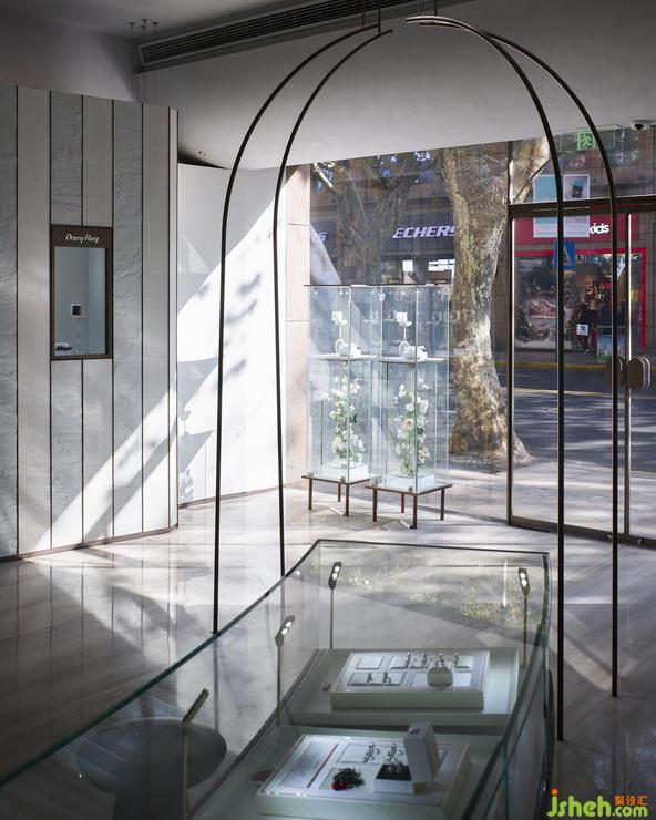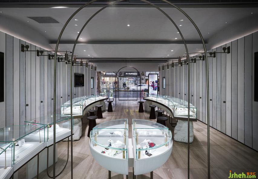汲取羅馬Basilica教堂建築布局,廊側(cè)圓柱幻化為燈飾、展櫃的序列,區(qū)隔成左右映襯的長(zhǎng)型空間,延伸至春花爛漫的雅致端景。仿若教堂的半圓後殿(Apse),玻璃帷幕的圓弧花牆取代了既定的古典壁畫(huà)、彩繪窗花;獨(dú)立式的圓形展臺(tái),成為端景前的祭壇喻象,圓拱、對(duì)稱(chēng)之美的古典元素,在幻如聖殿的典雅空間,譜出相映成對(duì)的儀式情境。