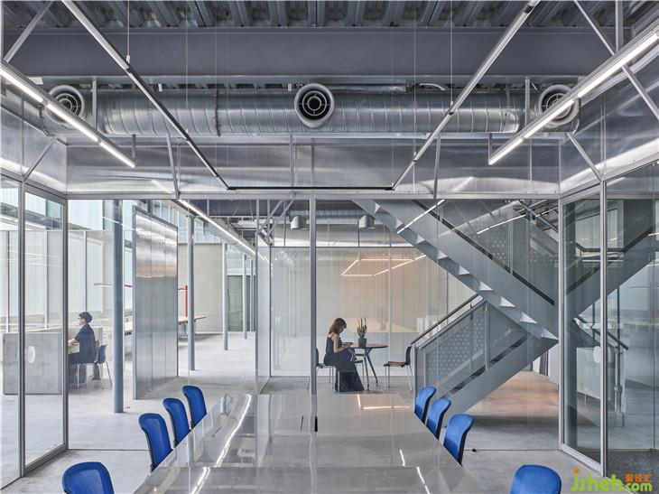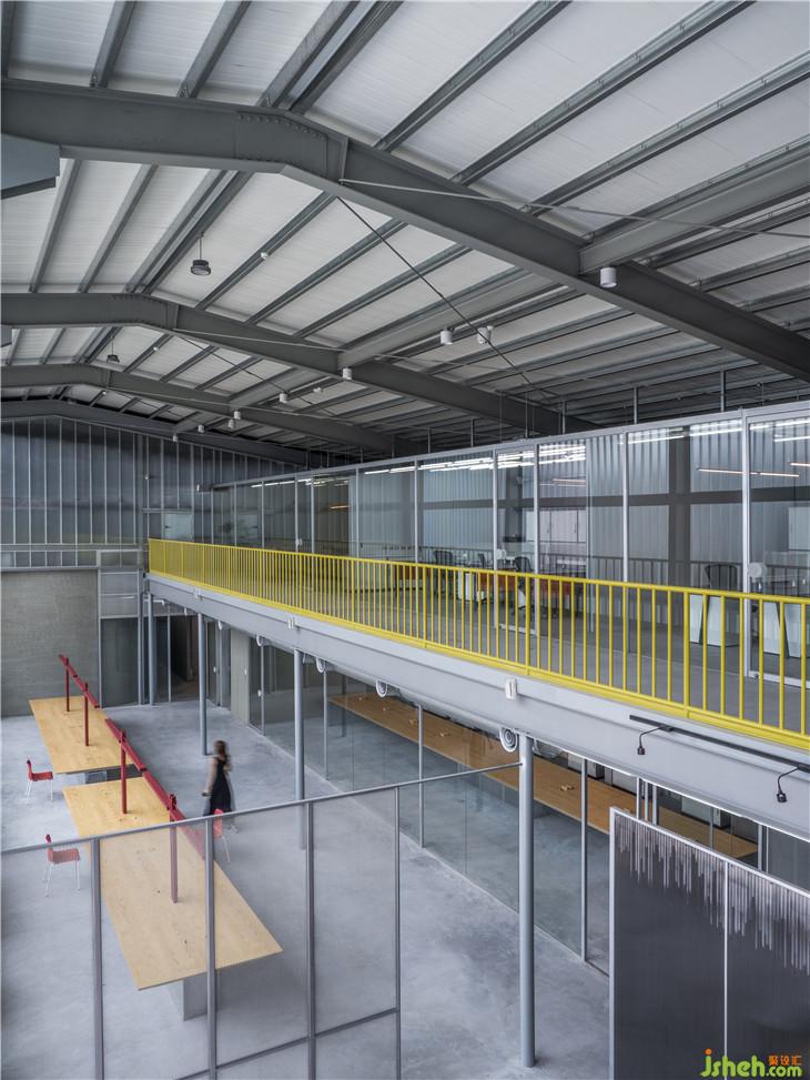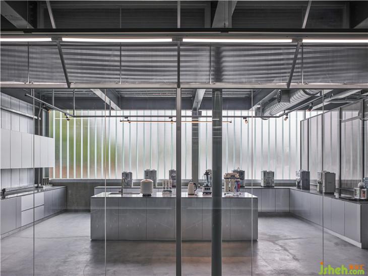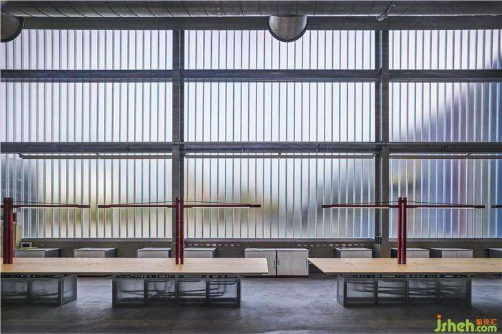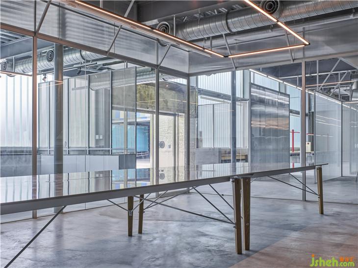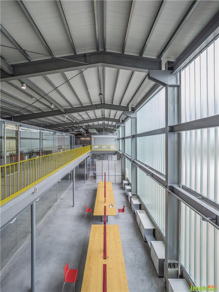 原為倉庫空間的基地,保留舊建筑的結(jié)構(gòu)與布局,在既有的圍欄著上檸檬黃的輕盈色調(diào),彷如新生品牌的革新企圖。半透光的U型玻璃取代正立面鐵皮及開窗,一解晦暗的廠房通病,隨著流動(dòng)的采光浸透于玻璃外墻,堆垛出各色的朦朧霓虹,與旁側(cè)的濃彩廠辦牆,建構(gòu)一幅融合現(xiàn)代簡約與色感美學(xué)的前衛(wèi)立面。透明塑膠浪板搭建的回收所,藉由光線照射,成為一座發(fā)光裝置量體,在前庭演繹回收再生的行為藝術(shù)。