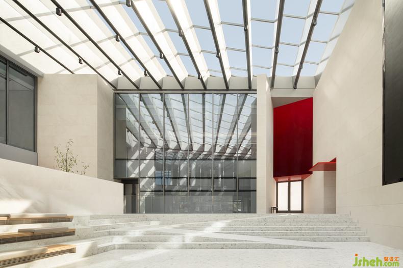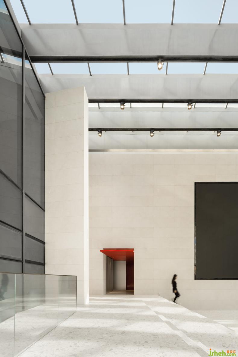 踏入建筑,入口由下挖式白色中庭建構(gòu)起點(diǎn),富節(jié)奏感的踏階環(huán)繞在側(cè),對(duì)人們行經(jīng)或逗留抱著從容姿態(tài),無主從之分的開放性路徑連接四方區(qū)域,擇其一進(jìn)入空間,這趟不是為了看一幅畫,而是親身浸入畫中。
