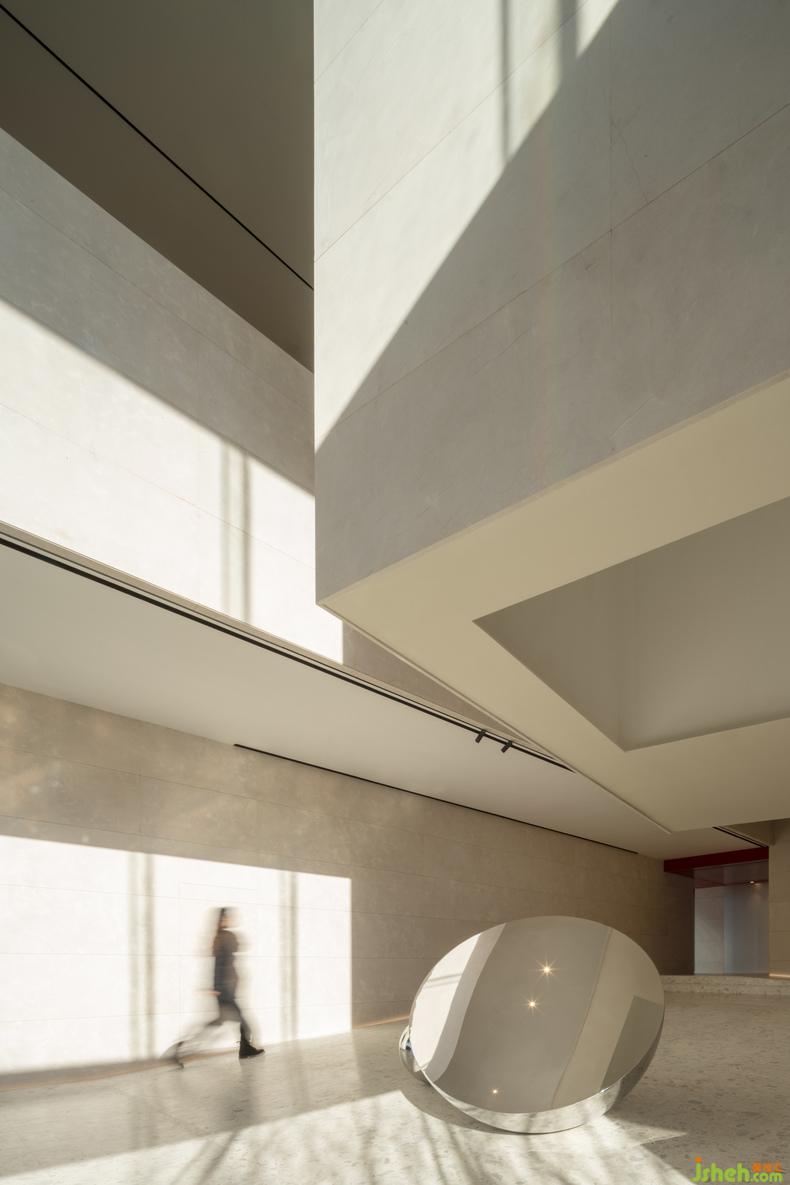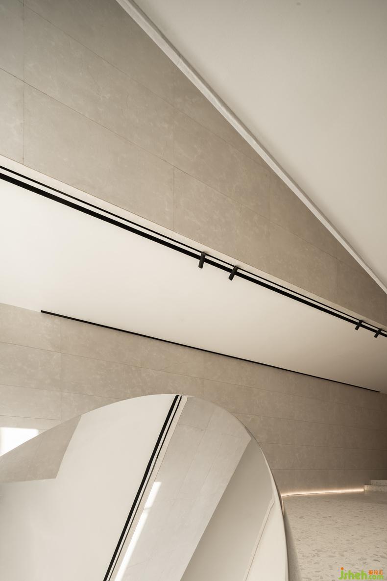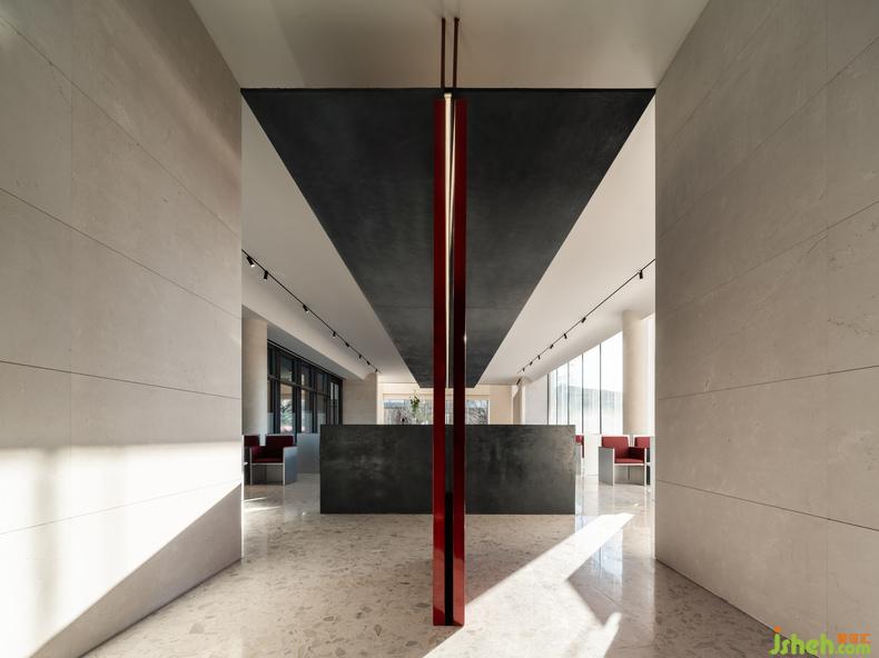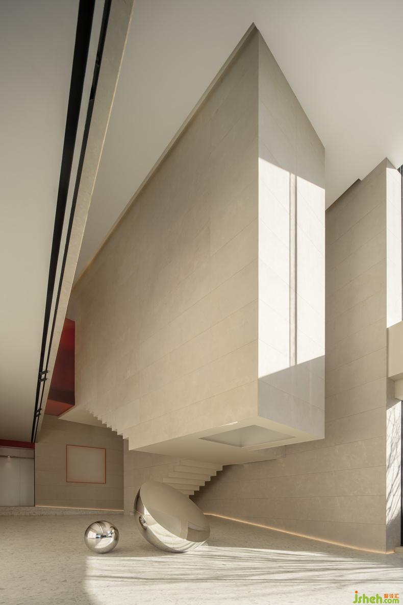大幅藍色安定了西側(cè)咖啡廳,吧臺或底墻,寧靜如靜夜海中黝暗的島嶼,安撫躁動,藝術(shù)中心設計使人放心將自己安置其中。飽滿的紅,乍然現(xiàn)身又爽脆地收邊,例如中庭末端延伸向后的飛檐、色域之間的甬道,是路徑上落下的面包屑、畫中的楔子,毋需文字便能引導動線,使人順應直覺探索未知,恰如創(chuàng)作者下筆時不假思索的意念。