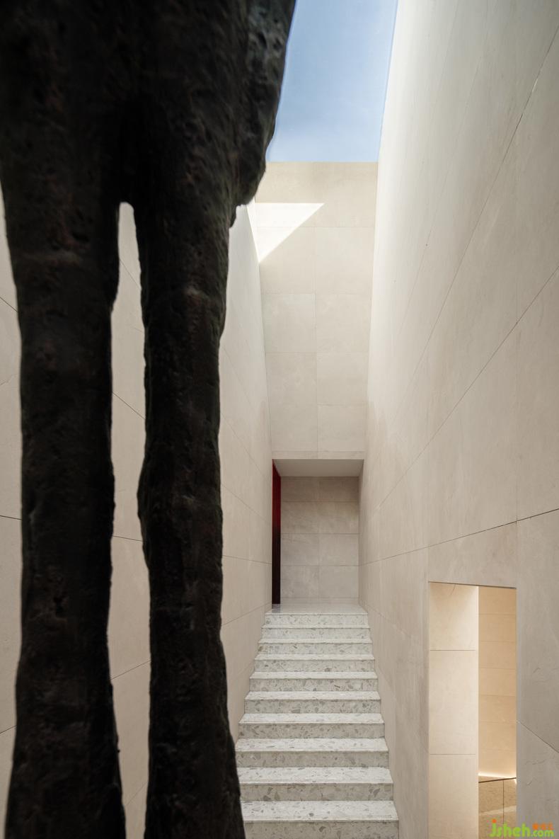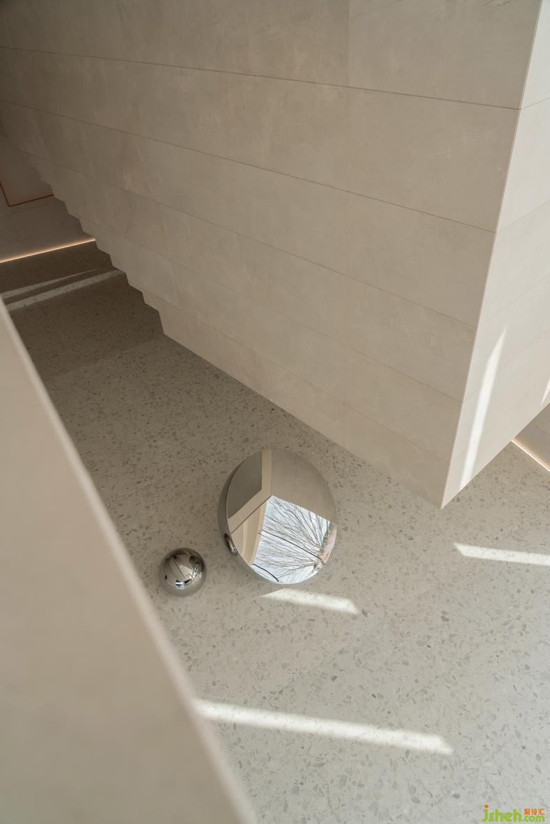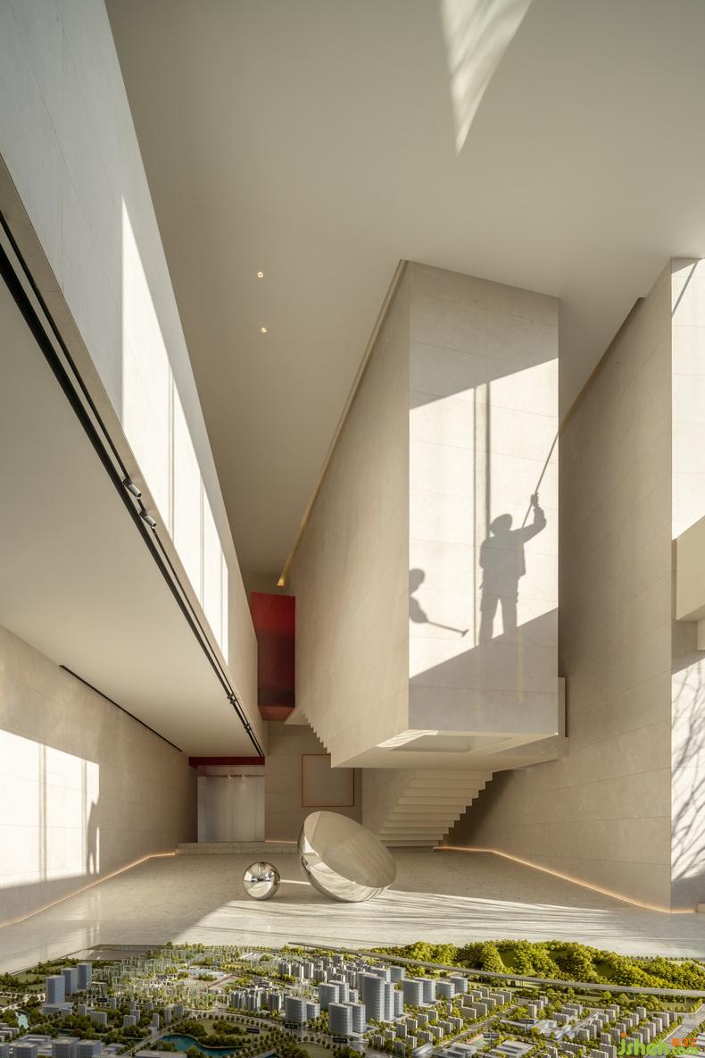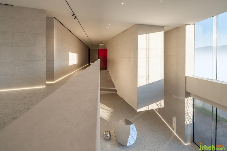 大幅藍色安定了西側(cè)咖啡廳,吧臺或底墻,寧靜如靜夜海中黝暗的島嶼,安撫躁動,藝術(shù)中心設計使人放心將自己安置其中。飽滿的紅,乍然現(xiàn)身又爽脆地收邊,例如中庭末端延伸向后的飛檐、色域之間的甬道,是路徑上落下的面包屑、畫中的楔子,毋需文字便能引導動線,使人順應直覺探索未知,恰如創(chuàng)作者下筆時不假思索的意念。