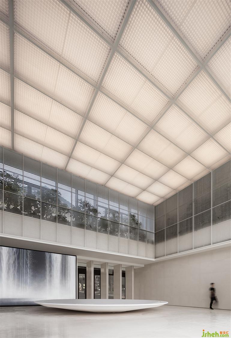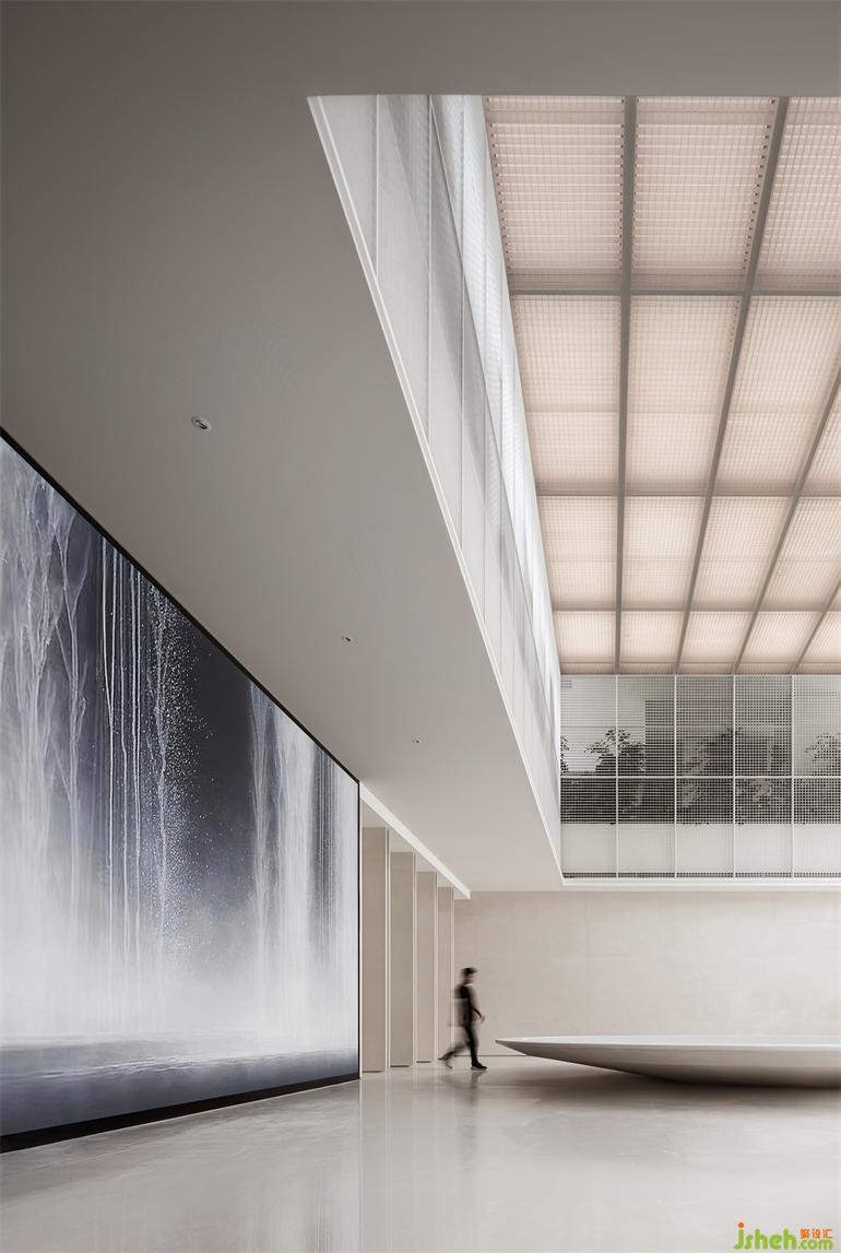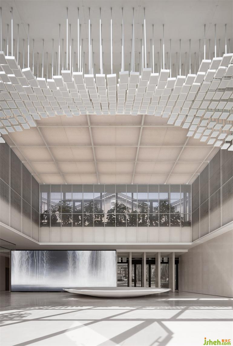想像踏入建筑即陷入一處多格放映的劇場,相較于喬木真實在旁的室內叢林,售樓處設計格柵及噴砂壓克力屏蔽的枝葉,因切割而輪廓離散如二維圖像,經由一格格數(shù)碼編排序出幻境,引人好奇:網格內的枝葉將以自然抑或數(shù)碼形式生長演化?
