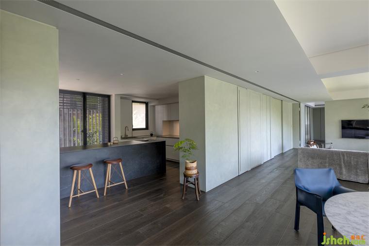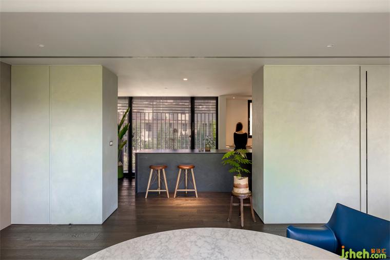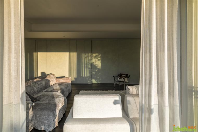 而漆料礦物粒子折射日光的強(qiáng)弱變化,住宅設(shè)計(jì)使早晨清麗如未散的薄霧,翠色漫著一層灰白;當(dāng)夕陽直射入室,色溫使墻轉(zhuǎn)為帶著光澤的碧綠;入夜開啟照明時(shí),白中帶綠的層次似暖玉,隨視角變換色階,如山色在有與沒有之間最美。