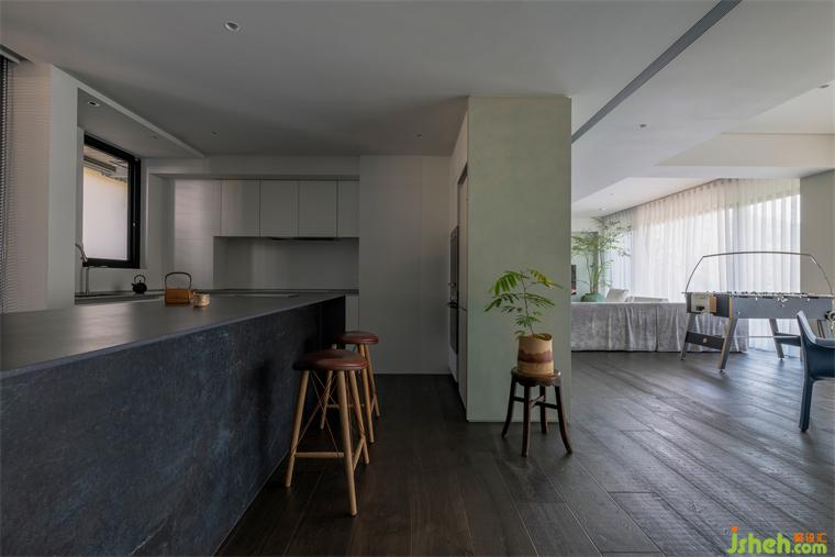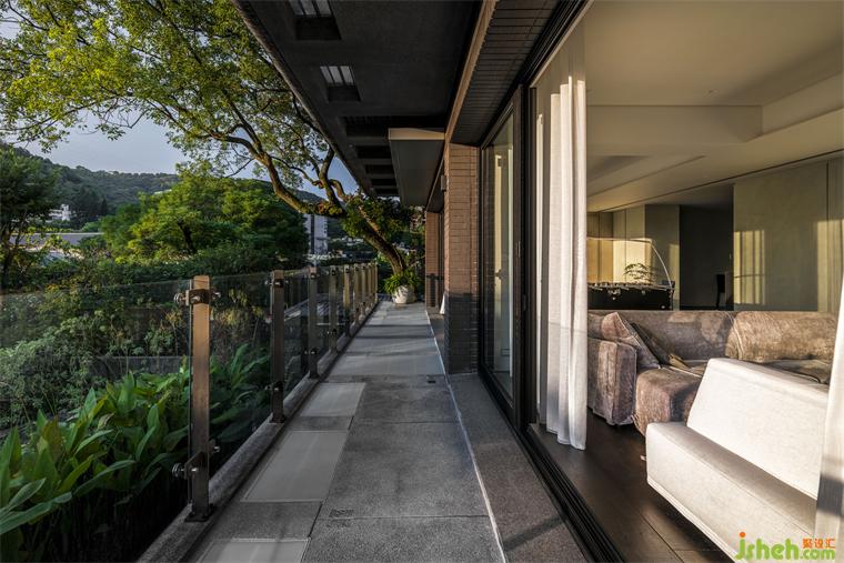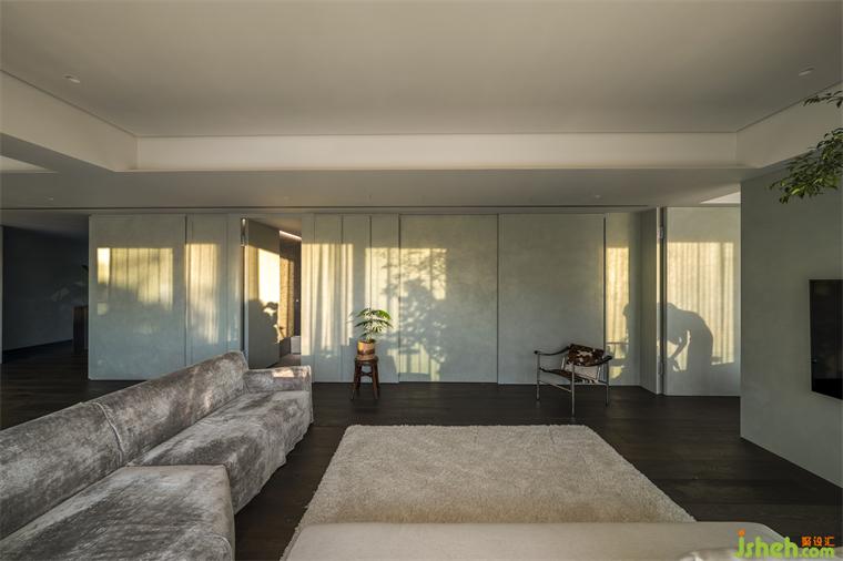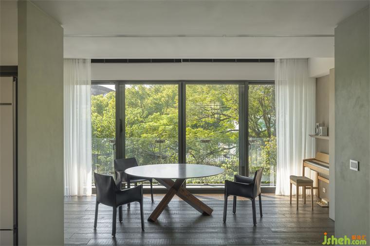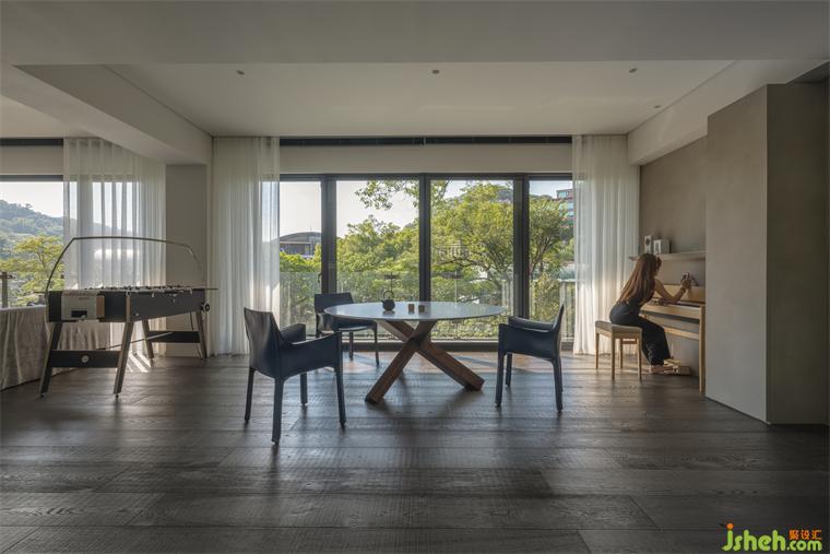 本案長型基地一側(cè)擁有連貫窗景和帶狀露臺(tái),住宅設(shè)計(jì)熟悉山林的屋主遷至市郊生活仍擇鄰近故宮、一處有山有溪的住所,希望自然曾經(jīng)帶給他們的情懷能在此繼續(xù)生長。我們將起居環(huán)境視為呼應(yīng)戶外溪林的文本,企圖在故宮藏品間找到表現(xiàn)空間的調(diào)子。