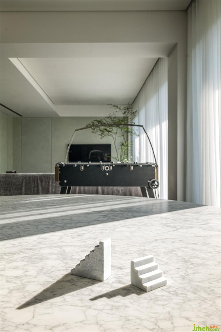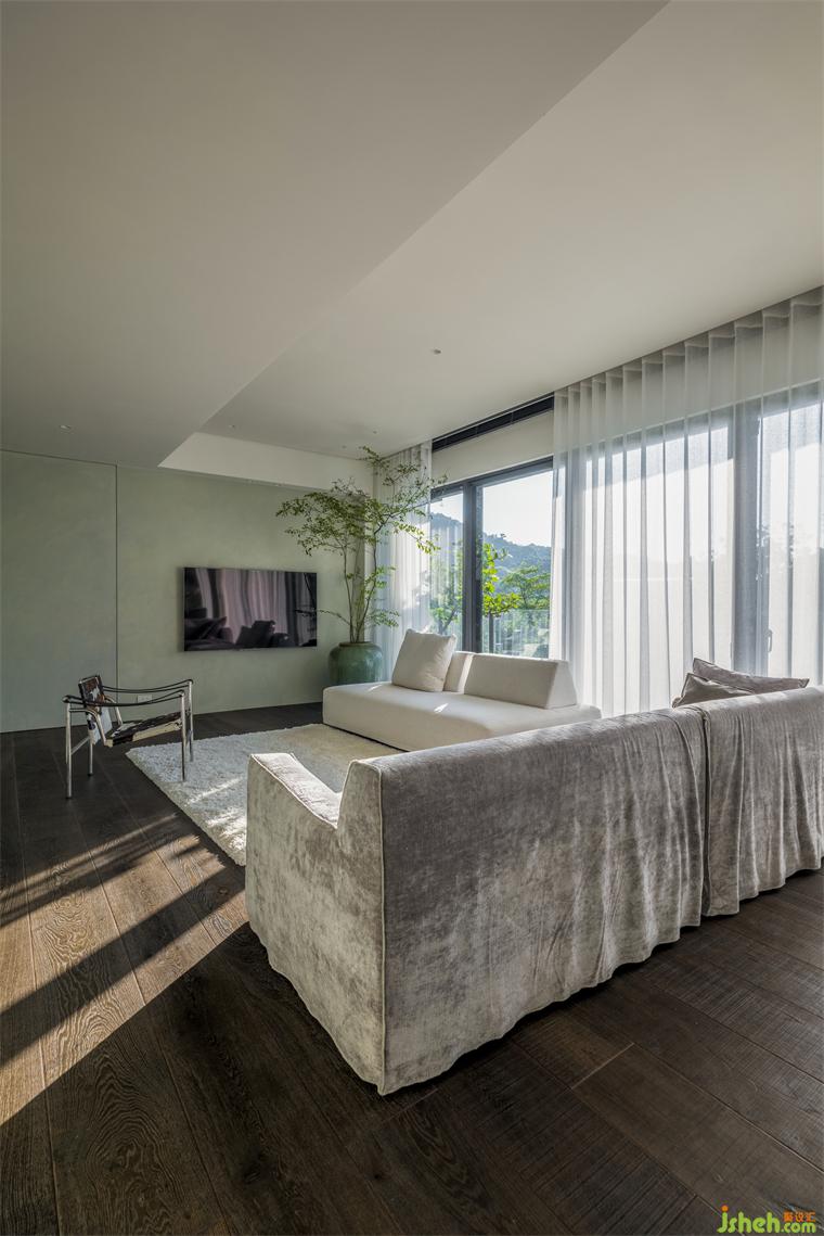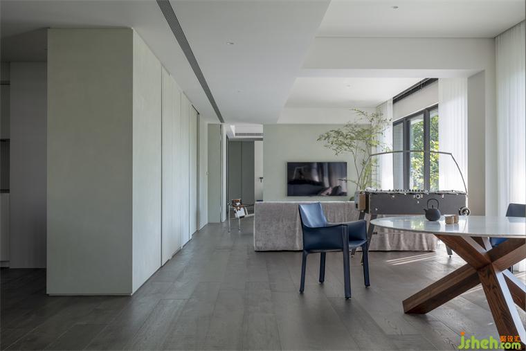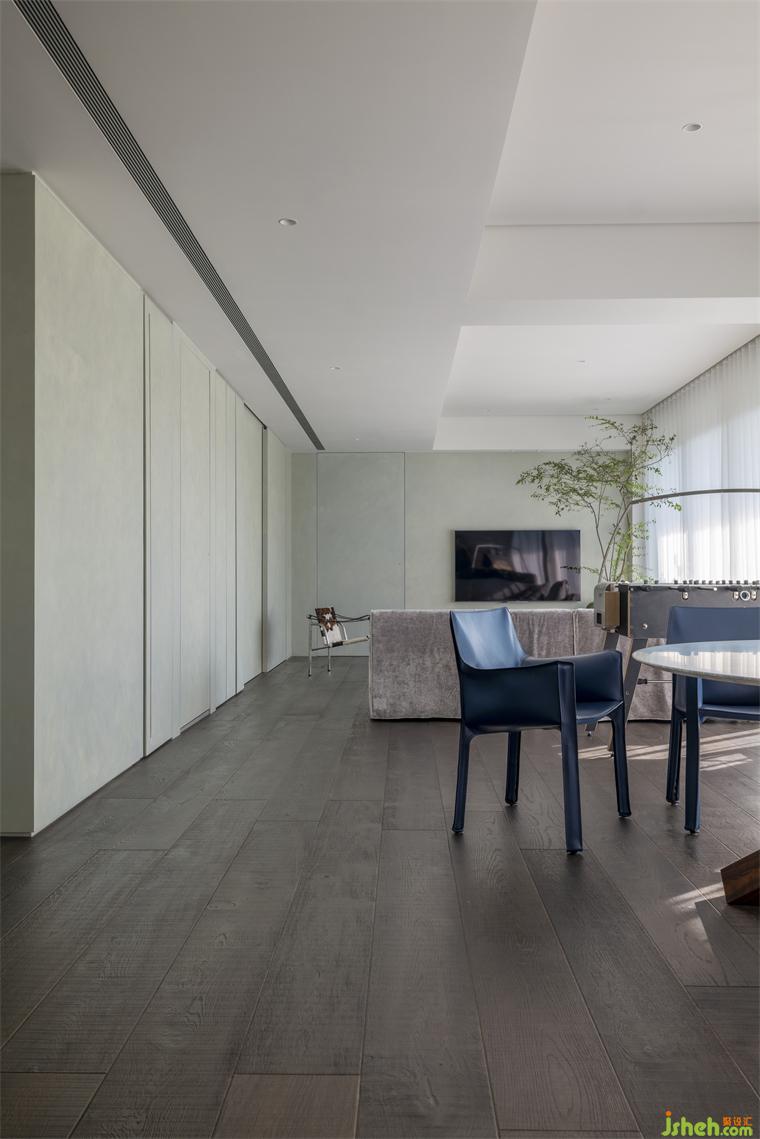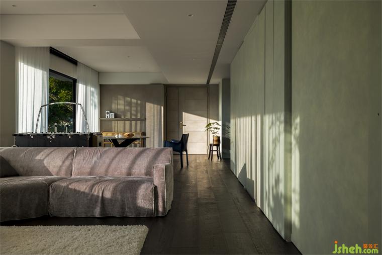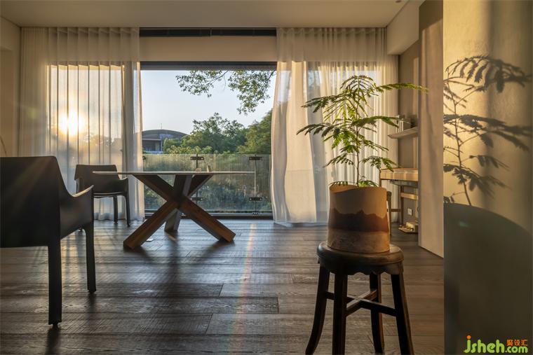 以釉色勻墻,地面便想以水墨襯出場景重量,住宅設(shè)計因為若以常見橡木色襯底,重心不足會使秘色顯得飄忽猶疑,反而以黑棕色為地坪,就如水墨畫中奠定層次的濃墨,在大尺度畫紙上穩(wěn)住各個元素的定位。且相較于淺色木質(zhì),夕陽映入室內(nèi)時,黑棕色地面更能襯出明暗節(jié)奏,在沈定的軸線上悠悠晾著光影。