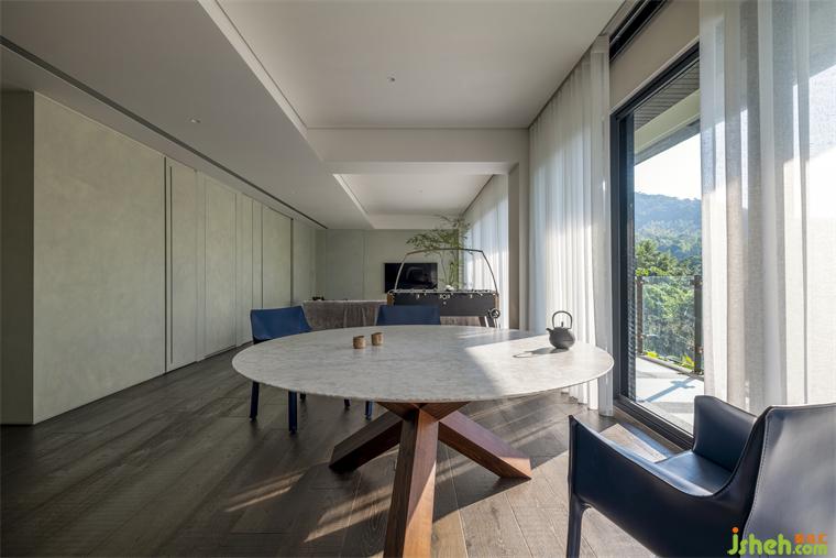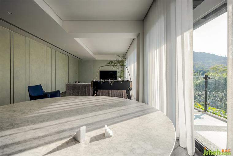 即便有隔間,屋里景色仍是流動的,如玉石的靜謐與光潤都是一氣呵成。當(dāng)風(fēng)自樹梢竄入撥動映在各處綠影,那是生活倚傍自然的況味,下一刻風(fēng)又靜下,山在畫外。