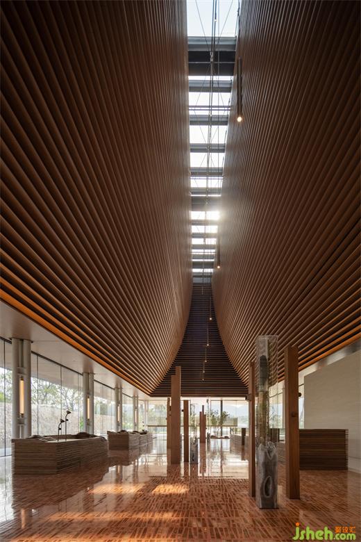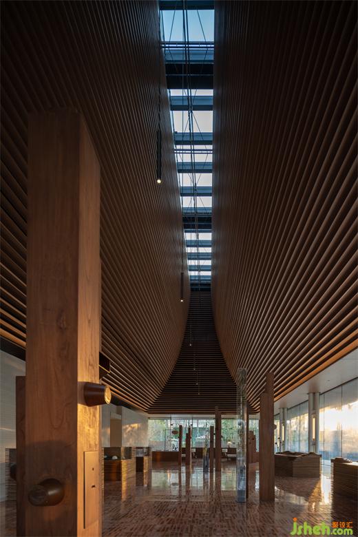 當業(yè)主方需三座館舍架構起中心,南島水岸特有的船屋畫面激發(fā)靈感,與建筑單位共同討論后舍棄冷硬框架,體驗館裝修設計選擇融合當?shù)孛缱濉妇勐涫健菇ㄖ鷳B(tài),包括內(nèi)外界線模糊的皮層、坡屋頂輪廓,有助空氣對流,也連結傳統(tǒng)屋宇順應環(huán)境的姿態(tài)。