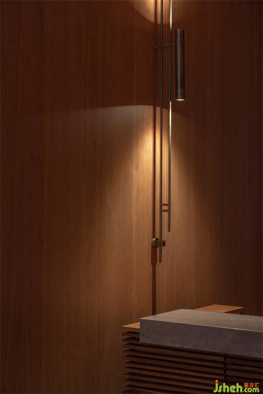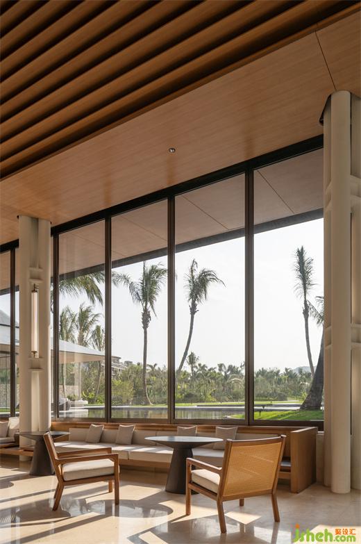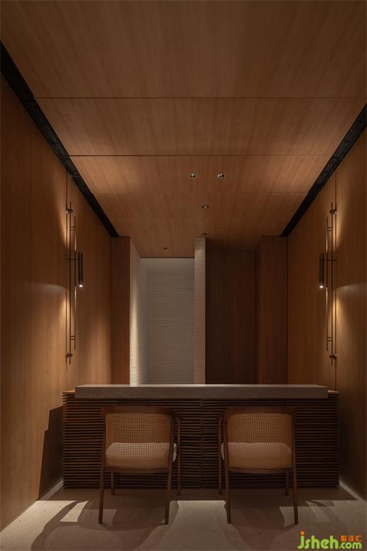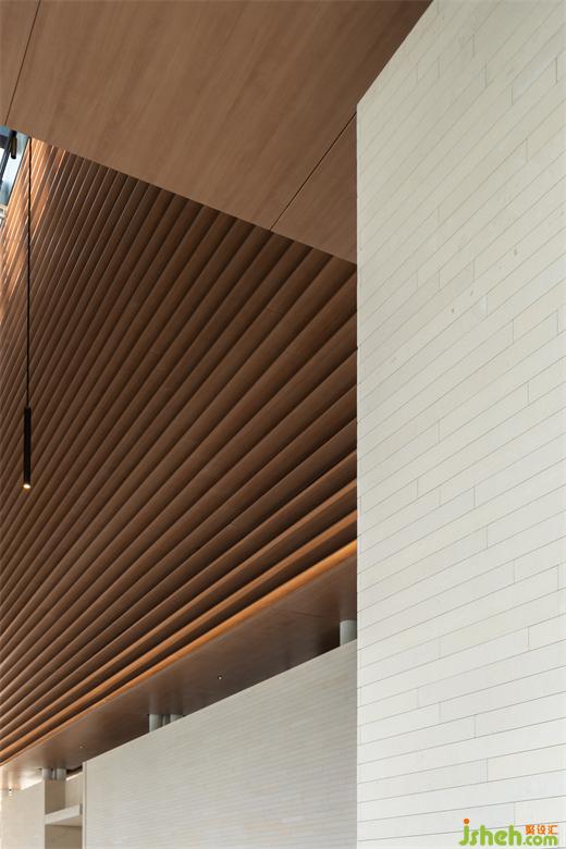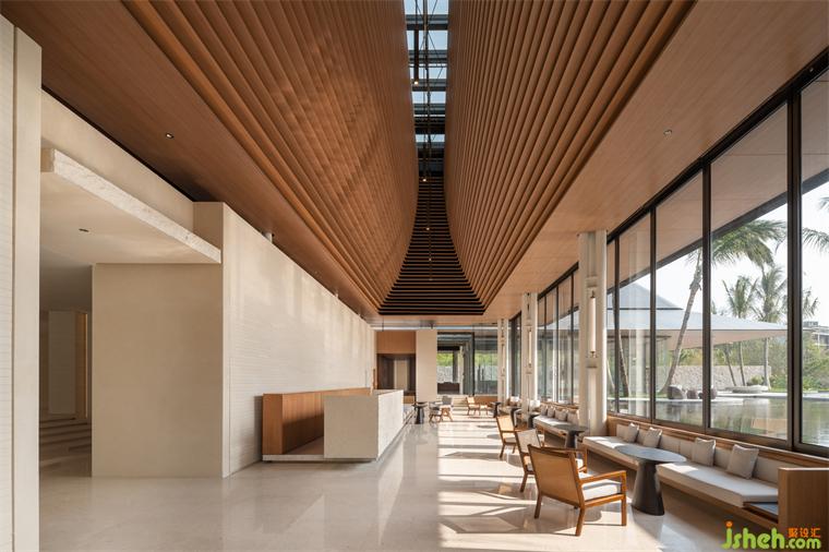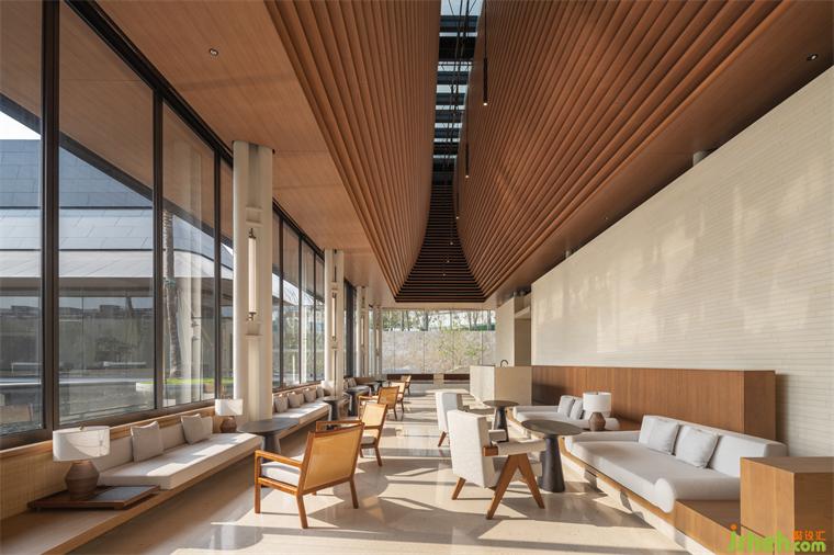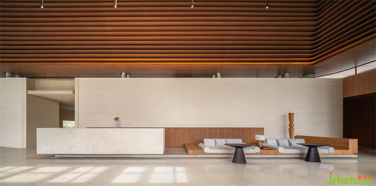 內(nèi)部以木格柵、帶狀開窗控制日光,削弱柱框立面截?cái)嗑吧?。道路旁、景觀資源較弱位置,內(nèi)退為服務(wù)核及后場(chǎng)空間。此外,為使設(shè)計(jì)所見即所用,也預(yù)想了未來應(yīng)用面,體驗(yàn)館裝修設(shè)計(jì)設(shè)定陳列及洽談空間的多元用途,以便適應(yīng)、延伸利用。