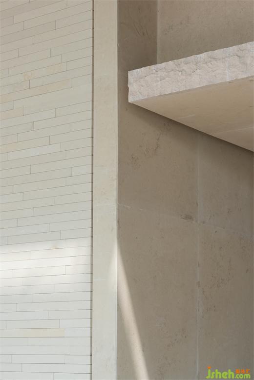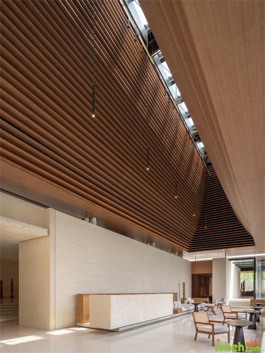 有別于水岸旁半開放空間,「日夢(mèng)長廊」利用半封閉中庭與長廊結(jié)構(gòu),塑造壓縮、釋放、自然交錯(cuò)的對(duì)比節(jié)奏,為達(dá)此效果,體驗(yàn)館裝修設(shè)計(jì)先以量體扎實(shí)米白石材包覆空間路徑,塑造層層框景的軸線起點(diǎn)。