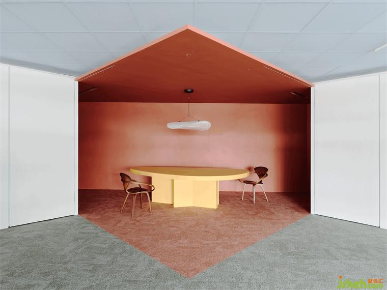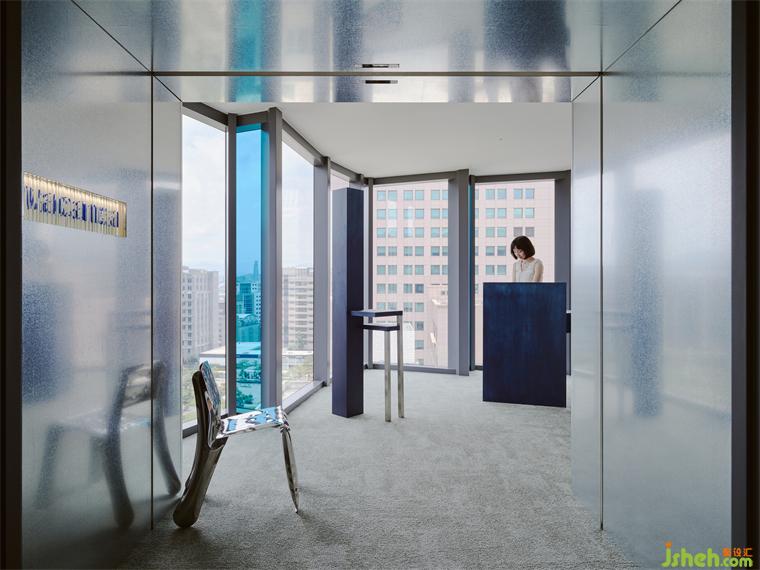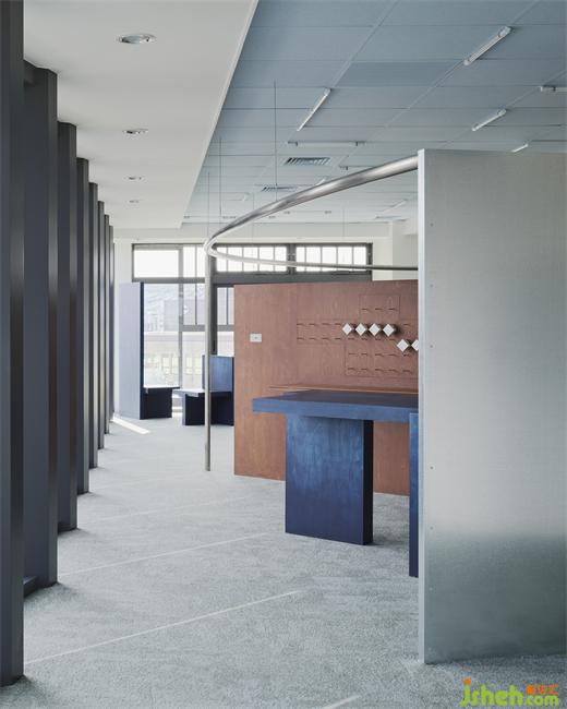 為此,設(shè)計(jì)師將入口臨窗西曬側(cè)設(shè)定為短暫停留的動(dòng)線區(qū),讓工作位置脫開日曬范圍,別于傳統(tǒng)接待柜臺(tái)及等候區(qū)模組,我們?cè)O(shè)計(jì)幾座高背座椅建構(gòu)這段過(guò)度空間,這些看似隨機(jī)的塊面如雕塑錯(cuò)落于窗邊,辦公室設(shè)計(jì)比固定隔間更具靈活性,其造型易于控制屏蔽比重又能遮陽(yáng),訪客候位可于椅陰影乘涼,業(yè)主也能利用如墻形式配置品牌訊息。