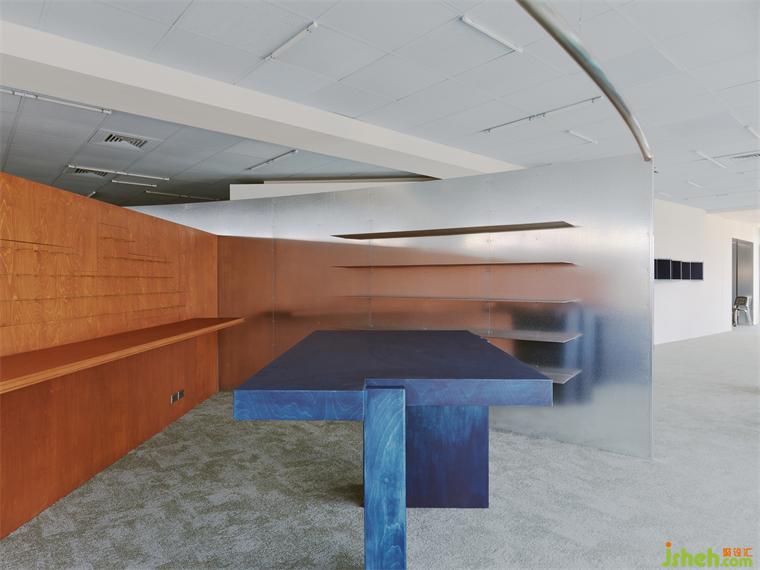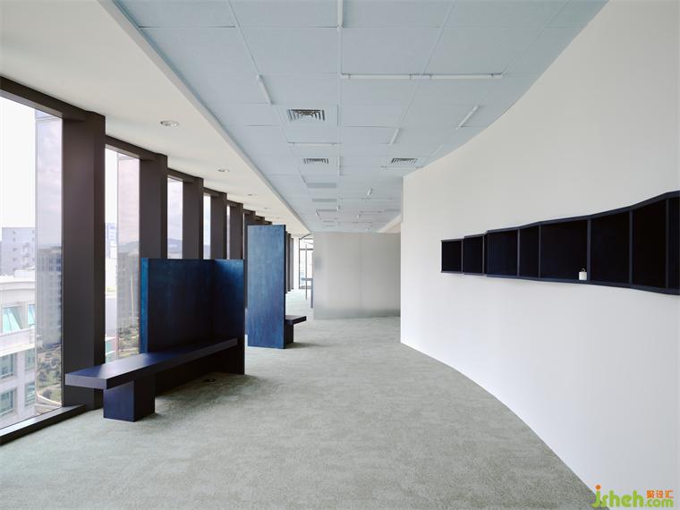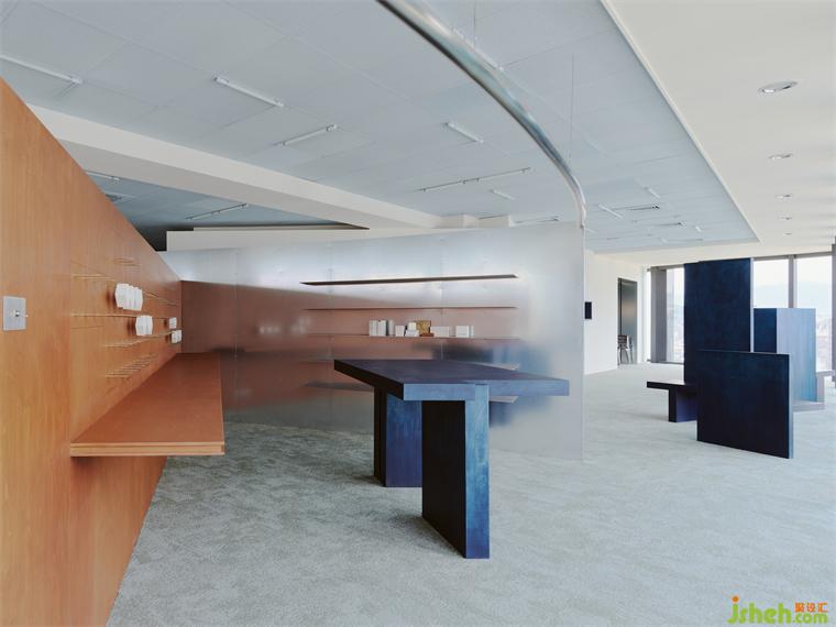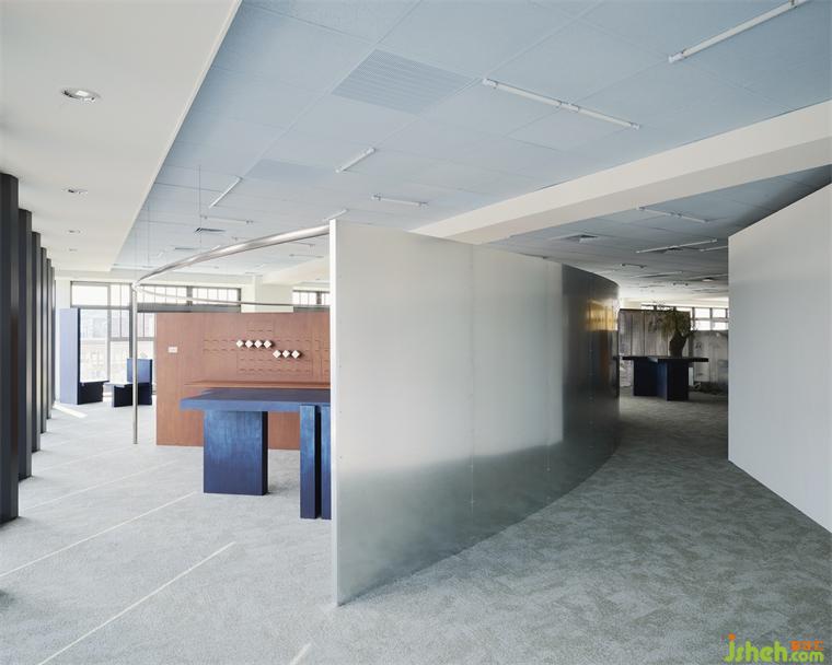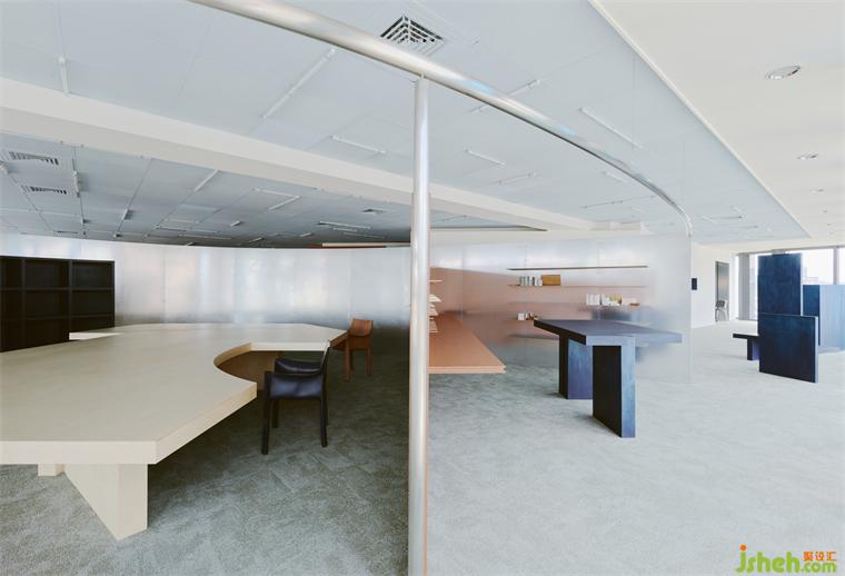 概分部門一段主要立面以不封閉動(dòng)線的弧墻,漸次展開各區(qū)域工作動(dòng)態(tài)。步入開放辦公區(qū),將先迎來(lái)商品展示區(qū)、商品開發(fā)部門及總監(jiān)辦公室。此區(qū)亦作為空間核心,水滴狀曲面界定商開部座位與總監(jiān)室的范圍,卻非完全截?cái)鄤?dòng)線、采光,由于商品開發(fā)部門是強(qiáng)調(diào)創(chuàng)意屬性的空間,互動(dòng)性跟關(guān)聯(lián)性的需求強(qiáng)烈,也需比鄰總監(jiān)辦公室,充分發(fā)揮討論的即時(shí)性。