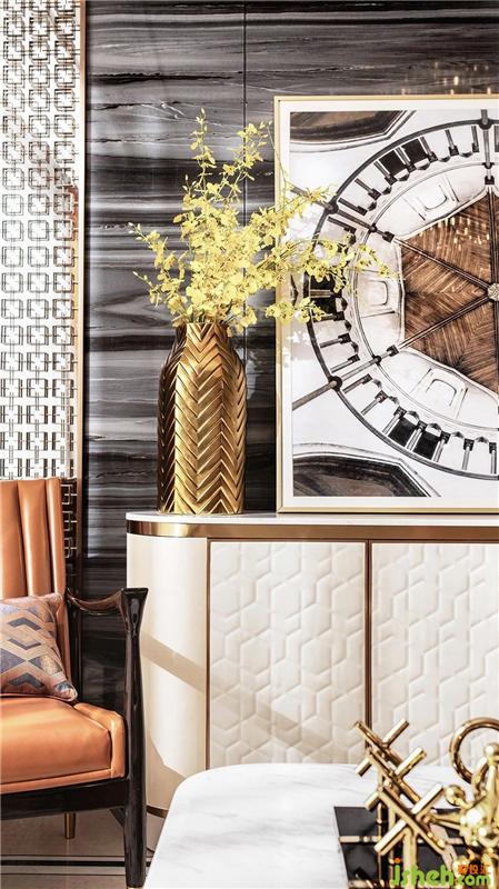 整體空間以米咖色搭配橘色為主。色彩冷靜,線條簡單。以金屬色、皮革硬包以及線條感營造空間的品質感,簡潔而不失時尚感。