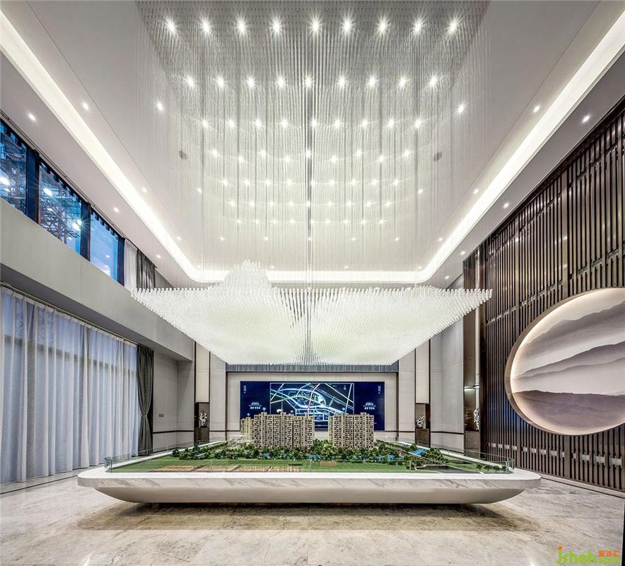 ▲整個沙盤區(qū),山形水晶吊燈垂感十分強勁有力,瞬間將天花與地面緊密銜接......