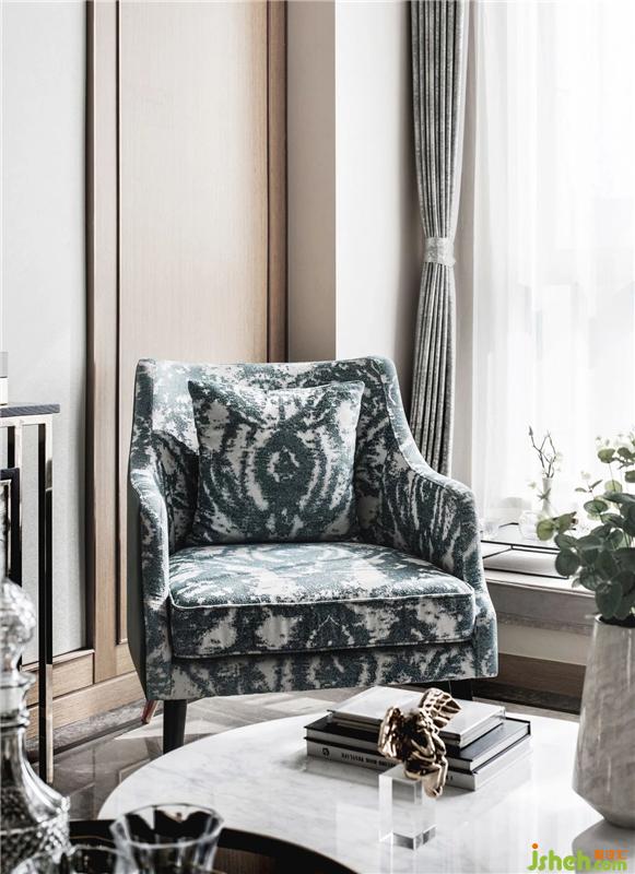 空間以湖水綠為點(diǎn)綴色,布藝上使用絲絨、皮質(zhì)面料,加上些許銅質(zhì)金屬,整個(gè)空間溫馨且華貴。