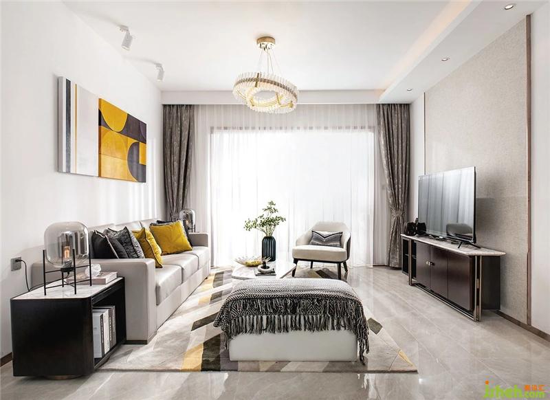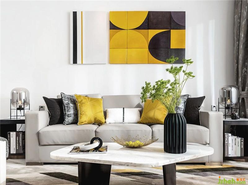 本案以灰色米色與輕快的黃色調(diào)為主色調(diào),營造出簡約、舒適、溫馨的室內(nèi)生活空間。黃色作為空間點綴色,傳遞出一種輕松、愜意的氛圍。