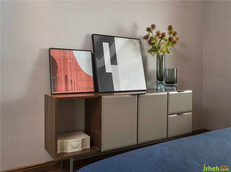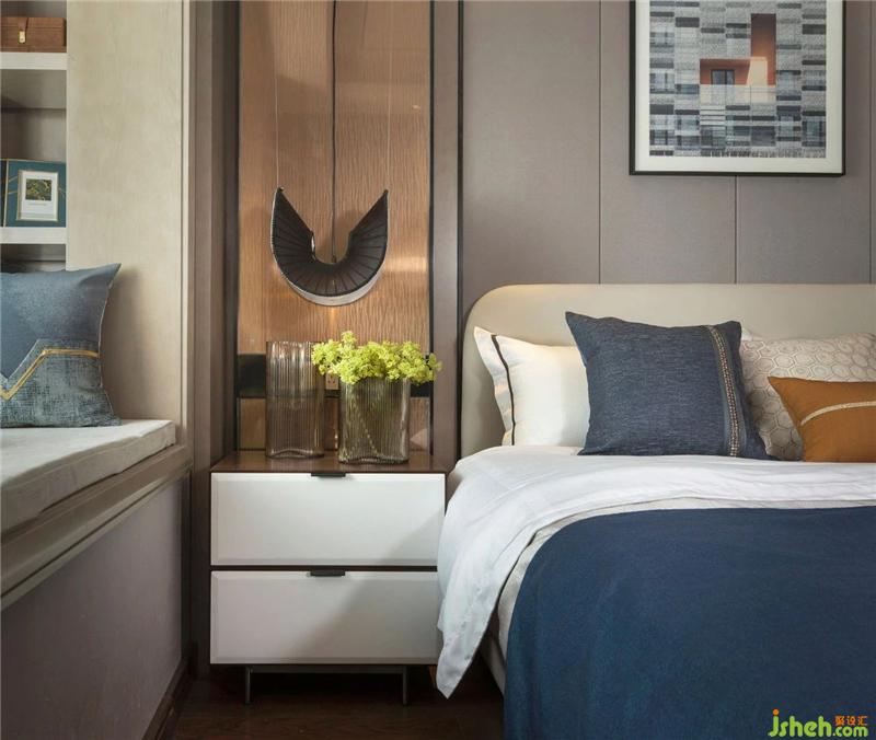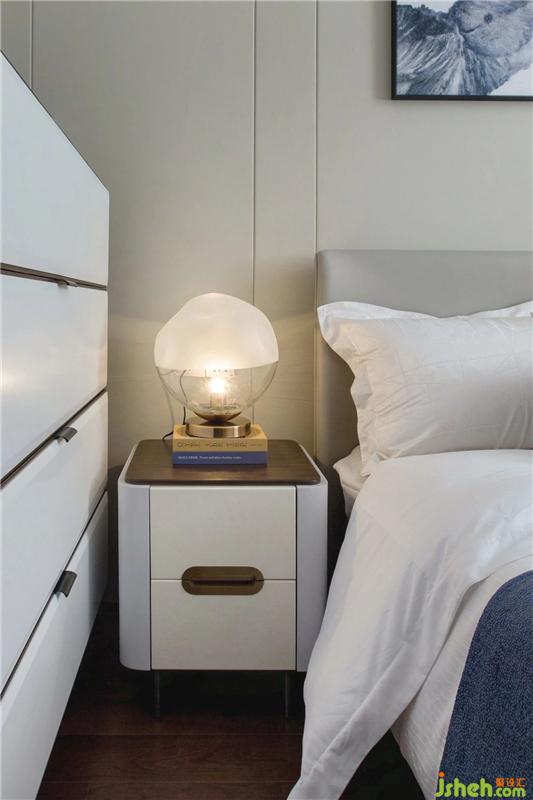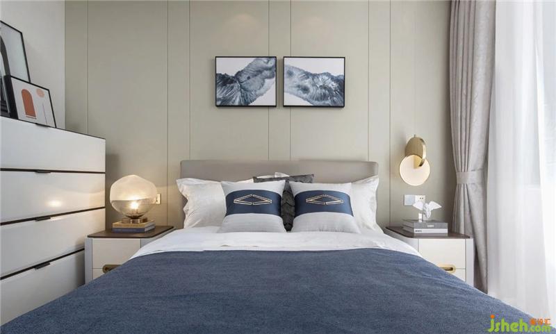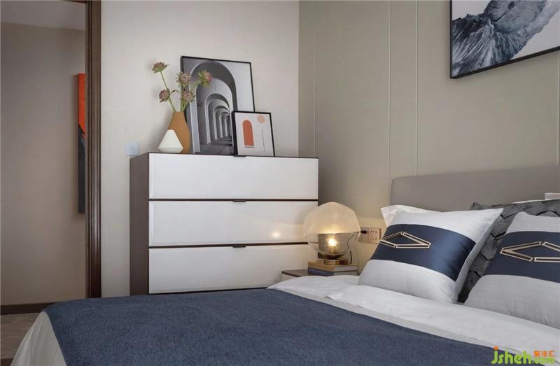 次臥的冷色床品與墻面、掛畫相搭配,乳白色柜體有了棕色的裝飾條,光源的暖色也不會顯得突兀。