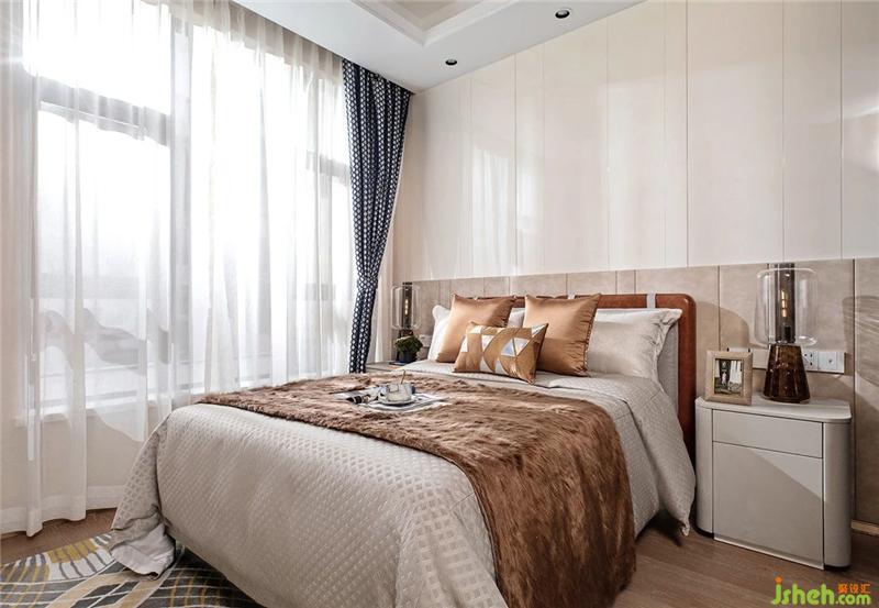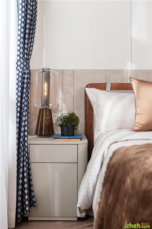 金屬質感飾品傳遞出舒適與時尚并存的藝術氣息。布藝柔軟,金屬堅硬,兩者相遇,各自獨特的光澤營造出滿滿的質感,絕妙地平衡了各自的優(yōu)缺點。質感、優(yōu)雅、舒適、強調(diào)細節(jié)、沉穩(wěn)內(nèi)斂,這些條件構成了主臥藝術風的撩人氣質。樣板房設計