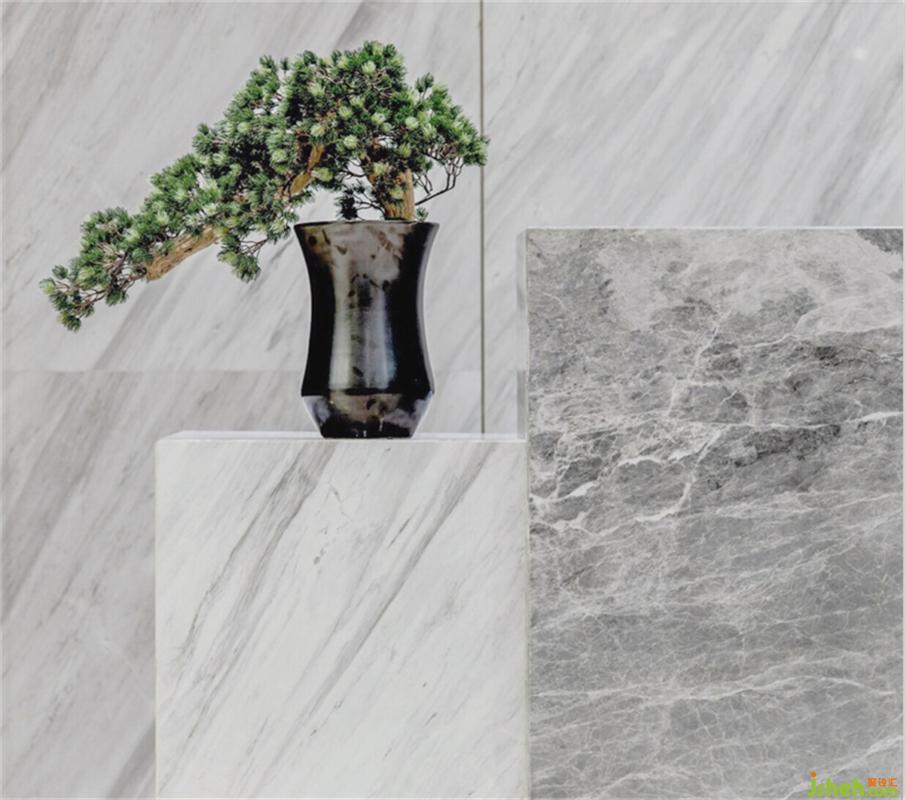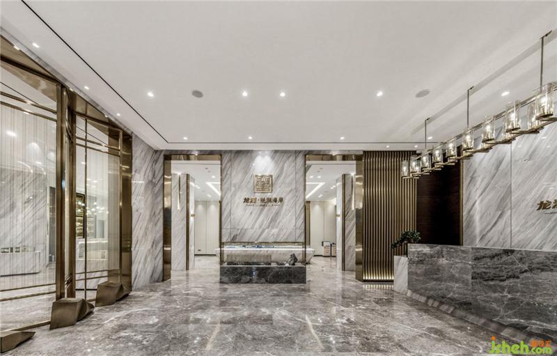 空間整體呈現(xiàn)淡泊寧?kù)o悠遠(yuǎn)的色調(diào),圍合成一片極具空曠的意境空間。地面大面積的爵士白大理石與卡門(mén)灰大理石大量鋪陳營(yíng)造出“白云升遠(yuǎn)岫,搖曳入晴空”的意境美。
