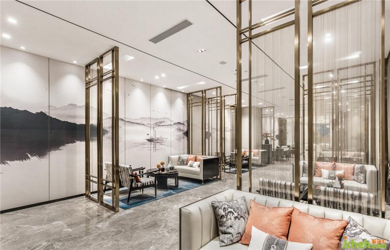 In the design of the negotiation area, in order to enhance the sensory experience of the visitors, the designer used a combination of a metal grille and a wallpaper printed with landscapes to use the light and shadow techniques to express the magnificent scenery of the mountains and the clouds.
