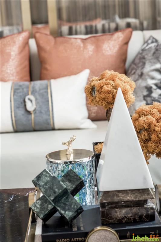 簡潔大方的設(shè)計既保留了傳統(tǒng)神韻,又加以簡化創(chuàng)新,一步一景,充滿意趣,有時候無需大肆渲染,僅用一顆枯枝、幾粒砂石、一束柔和的燈光搭配盆栽、古玩等精妙小品,就能做成一處雅致的端景,讓空間層次更顯豐富。