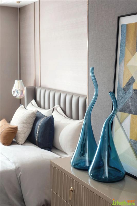 空間承載著生活,每個(gè)人都是生活家。緊張快節(jié)奏的都市生活下,為了讓業(yè)主在回家之后能卸下身上的疲憊,隨心所欲的做自己,主臥整體空間采用了柔和的色調(diào),精致的床品,不同肌理的碰撞,來體現(xiàn)層次感,也豐富了空間展現(xiàn)的視覺效果。電視柜的掛畫成了整個(gè)空間的點(diǎn)睛之筆,仿佛把維港的靜謐與璀璨帶入眼前。樣板房設(shè)計(jì)