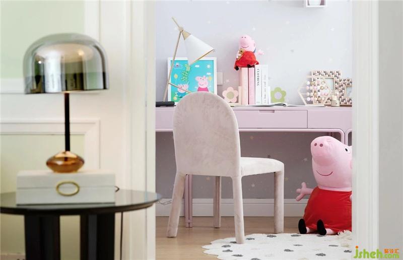 小孩房采用現(xiàn)在風靡全國的動畫片《小豬佩奇》作為主題,精致的金屬吊燈表現(xiàn)出整個空間的藝術(shù)氛圍,7歲的小女孩對動畫片充滿了無限的熱愛,用掛畫和飾品更為凸顯出小豬佩奇的主題性,也讓整個空間更具生活氣息。