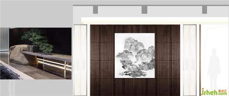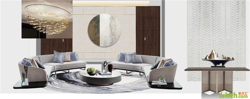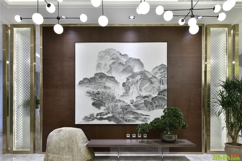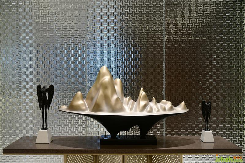 裝飾畫以“山”形貫穿于整個售樓處的各個空間,運用不同的裝飾手法,著力打造把自然界的景致“山·水”概念以抽象的形式陳設(shè)其中。The decorative painting runs through the various spaces of the entire sales office in the form of “mountain”. With different decorative techniques, it focuses on creating the concept of “mountain and water” in the natural world in an abstract form.