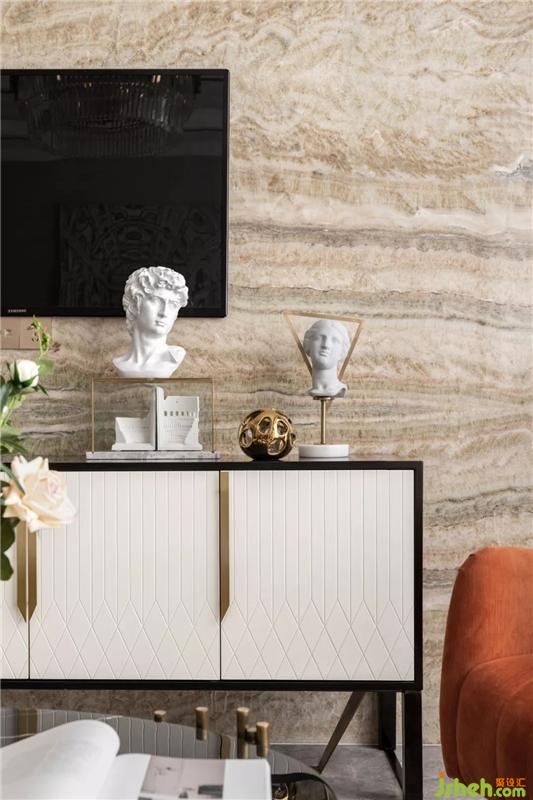 客廳整體空間色調(diào)以暖色調(diào)為主,橙色不僅彰顯出歡快活潑的光輝色彩,同時(shí)又給人一種莊嚴(yán)、尊貴、神秘的感覺。掛畫采用意大利攝影師馬西莫列斯德里拍攝的意大利北部公爵宮殿,不僅提升了空間藝術(shù)氛圍,從視覺上來(lái)說(shuō),掛畫的延伸,也讓整個(gè)空間更加的寬闊。