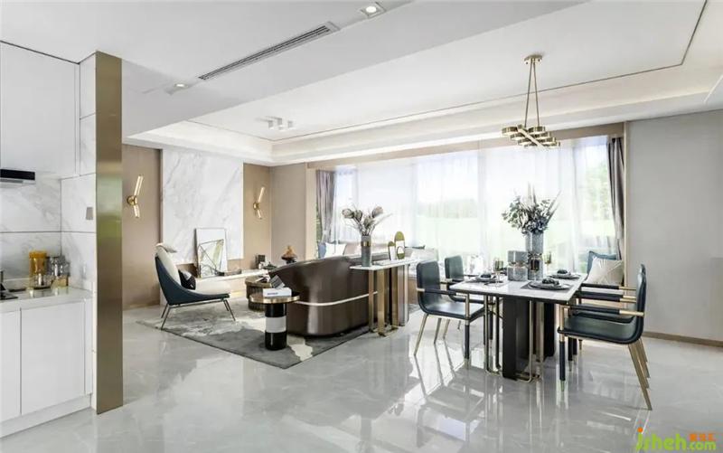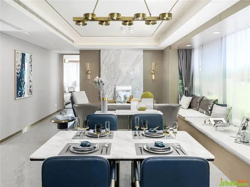 該戶型在色彩上以金屬的黃色系和淺灰色系為基調(diào),加入灰但不失亮的藍色系,絲絲漣漪又不失家的溫暖,同時契合杭州湖水的藍和夕陽的黃。樣板房設計