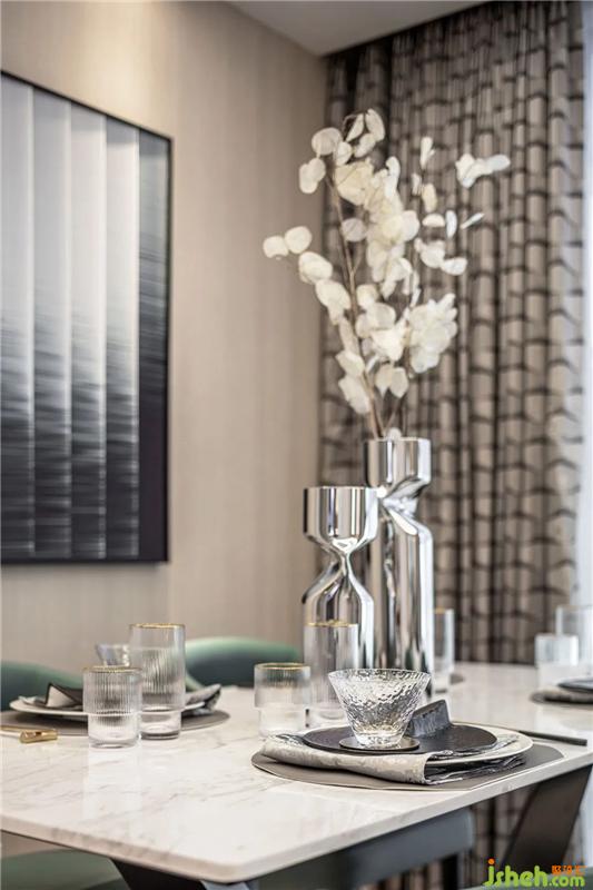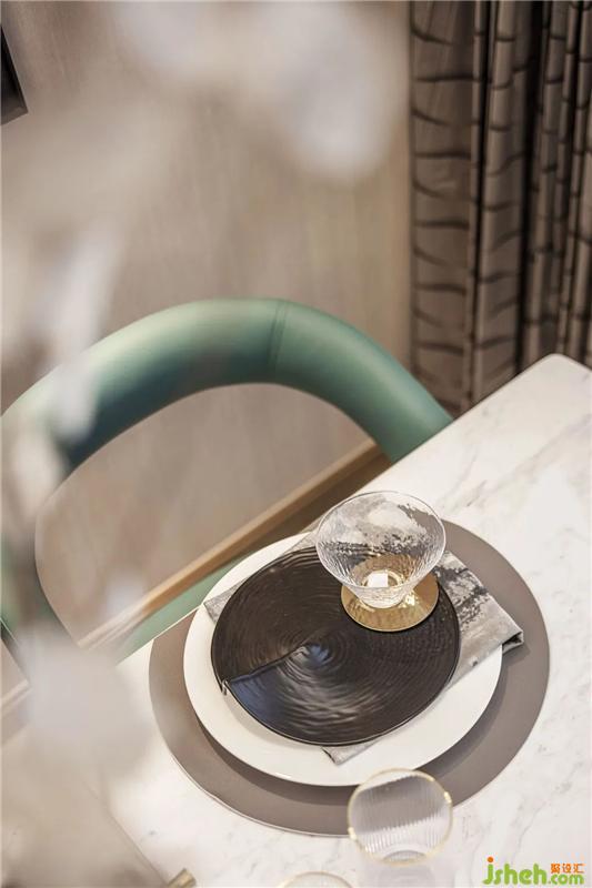 客廳作為空間交互的中心,大片落地窗與開闊的陽臺,讓光線被最大化地保留。撲面而來的綠奠定了空間的清涼感,金屬元素以不同形態(tài)點綴在家具、燈飾的細節(jié)上,空間顯得更加清透、明澈。當(dāng)代都市人追求的綠洲情調(diào)隨著顏色和材質(zhì)的暈染,意境全開。