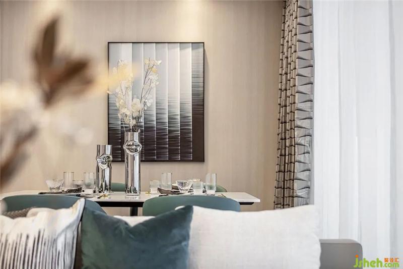 The living room serves as the center of spatial interaction, with large floor-to-ceiling windows and open balconies that allow light to be maximized. The rushing green laid the coolness of the space, and the metal elements were embellished on the details of furniture and lighting in different forms, making the space more clear and clear. The oasis sentiment pursued by contemporary urbanites is full of mood with the blooming colors and materials.
