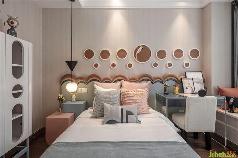 Illustrations, parrot dolls, and book books are displayed in an orderly manner in the children's room space. The design depicts the children's life scene and spiritual world in detail, supplemented by bright color blocks and lines, and the pure and simple daily setting is here.