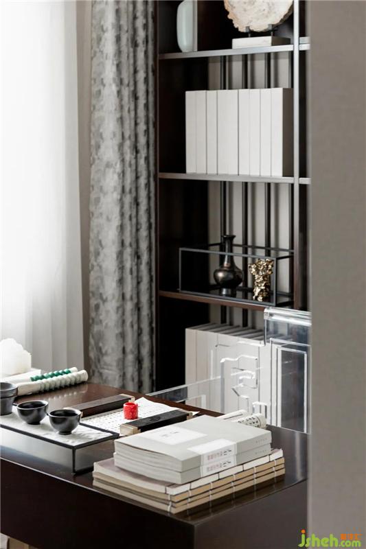 書房以筆法為主導,充分發(fā)揮墨法的功能。營造端莊素雅,使人凝神靜氣的空間氛圍,非常適合身處快節(jié)奏的現(xiàn)代都市人。