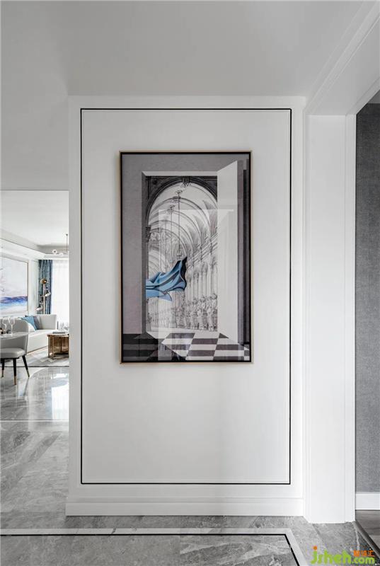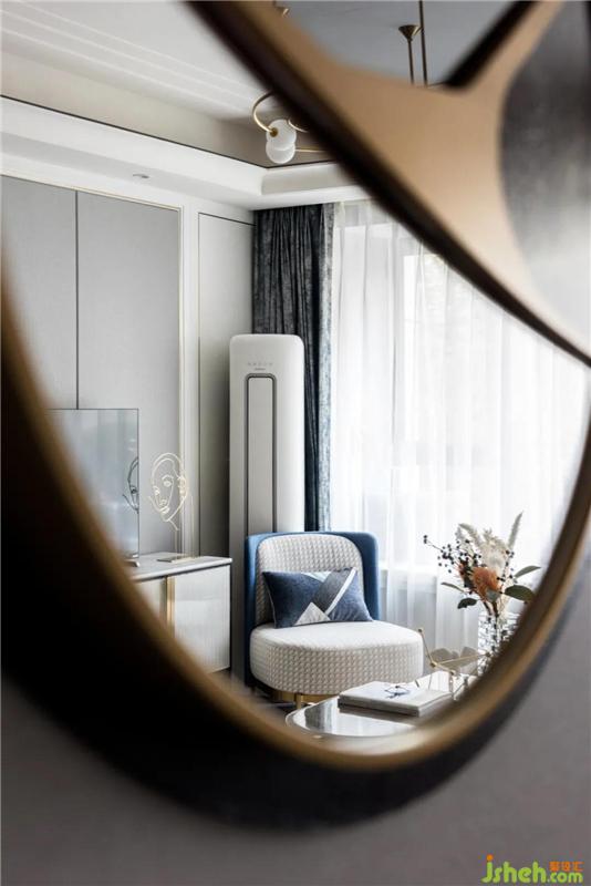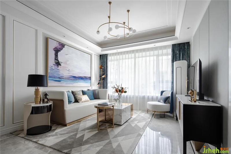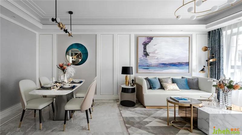 空間延續(xù)了硬裝的暖灰色,現(xiàn)代簡約白色的護墻板,室內(nèi)設計師選擇了灰色大理石地面和米色電視背景墻,讓整個空間更加優(yōu)雅、硬朗、大氣,營造現(xiàn)代奢華感。