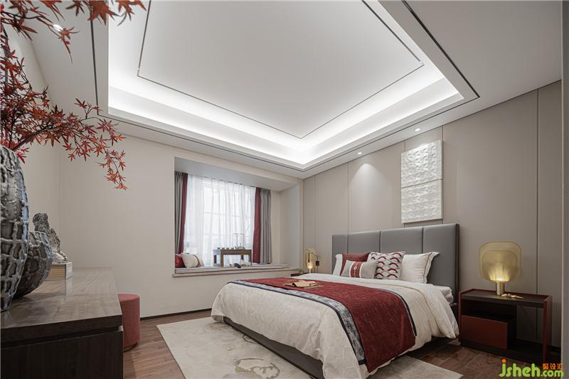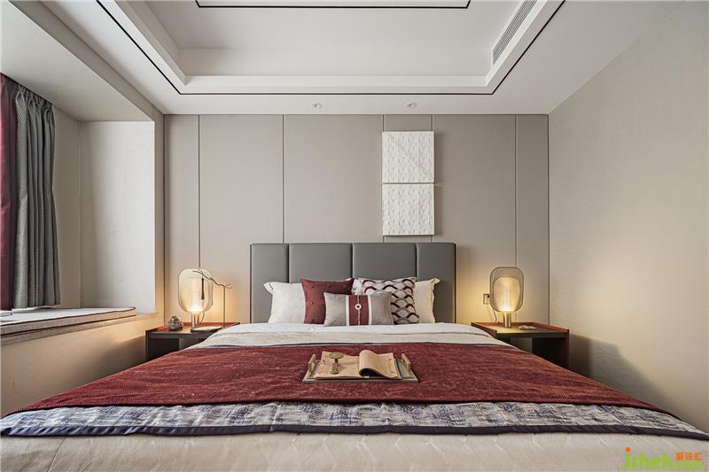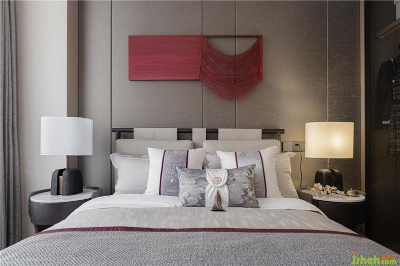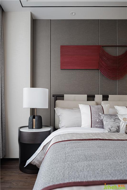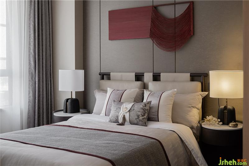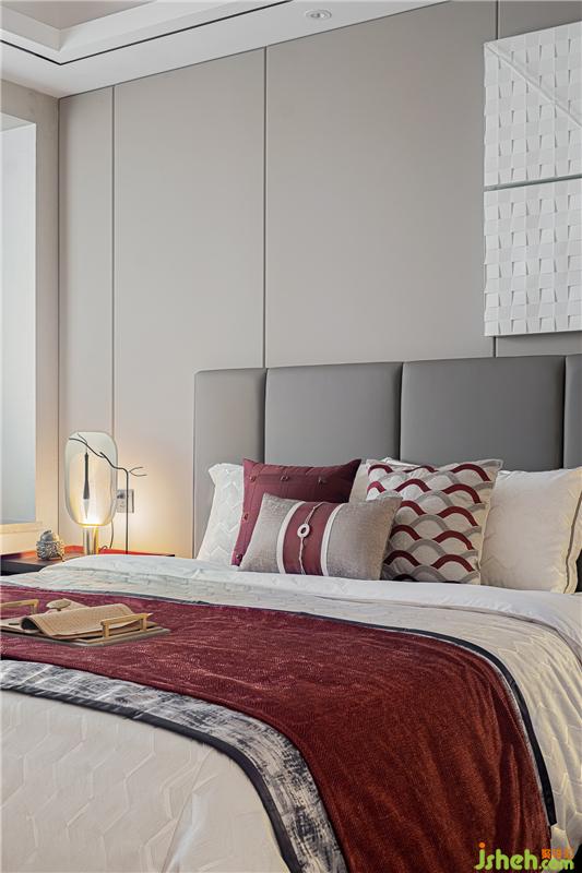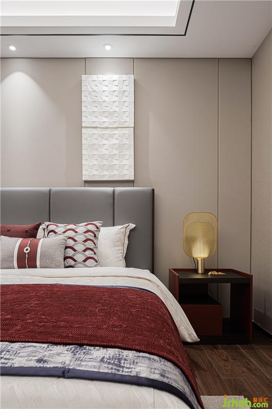 米灰為主色調(diào),配以紅色床品打破空間的沉悶,飾品精致簡潔,在柔和的美感中讓空間呈現(xiàn)愜意愉快的氣氛。
