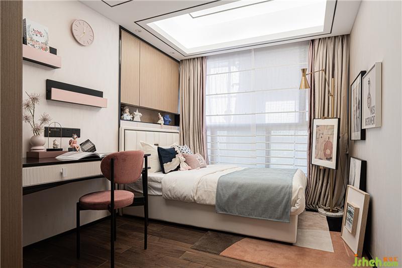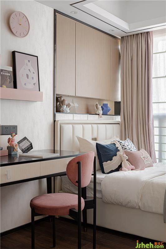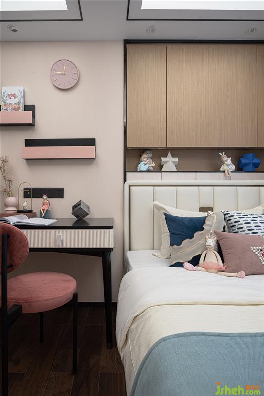 兒童房將實用與美感完美融合,藍色與藕粉色的組合則使空間更具活力,體現(xiàn)出孩子的靈氣活潑。