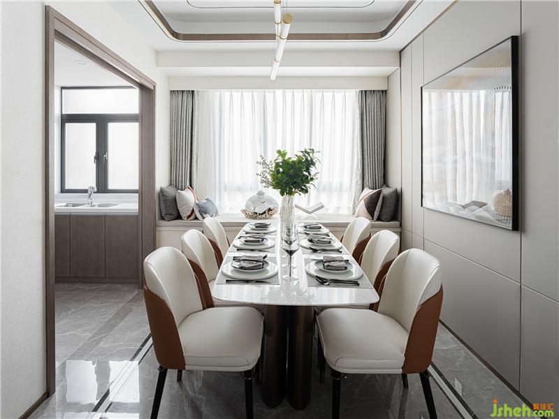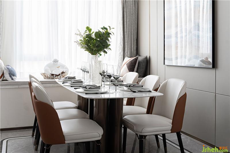 餐廳一桌六椅的配置,滿足了一家人的用餐需求。 現(xiàn)代主義餐桌椅的組合,打造餐廳時尚、雅奢的空間氛圍,餐椅的金屬細節(jié)提升家私的細節(jié)感受,造型獨特的吊燈為空間增加了記憶點。