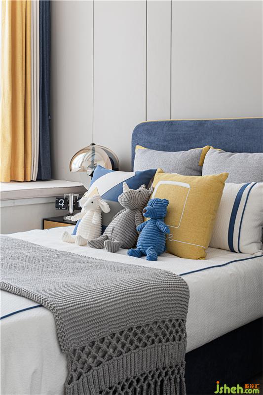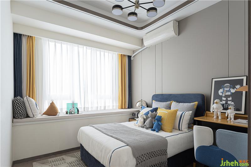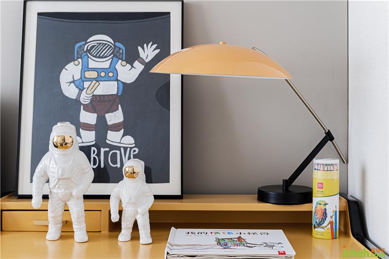 兒童房的太空主題給人以充滿童趣純真的感覺。采用與大空間相近的調(diào)性,僅在局部點綴出趣味盎然的擺件。黃藍色系提供了和煦的感受,隨著孩子的成長更能體會,真正的審美凝結(jié)在看不見的微妙之處,而不再是花花綠綠的細碎之中。