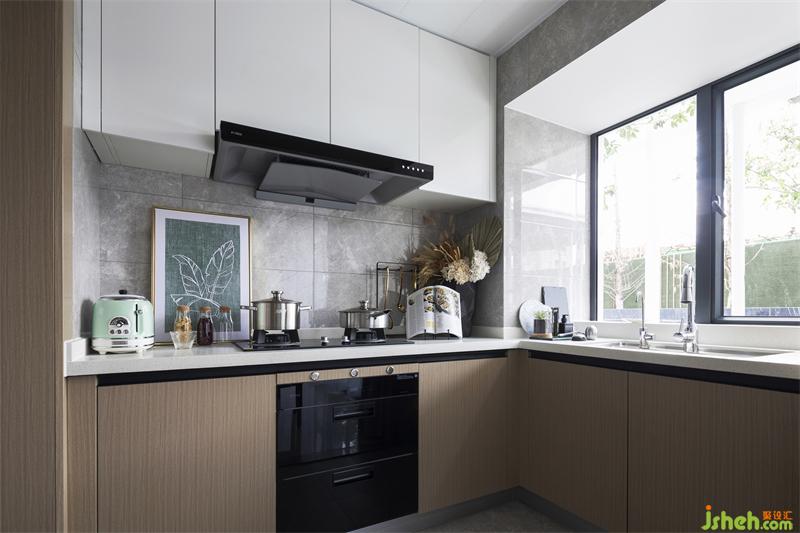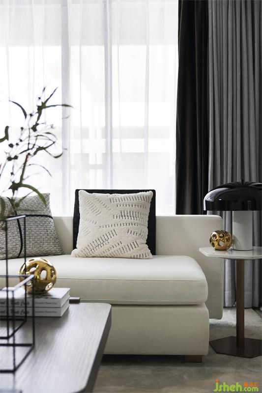 客廳通過(guò)開(kāi)放的空間設(shè)計(jì)與舒適的材料,營(yíng)造輕松、精致又不失格調(diào)的氛圍。黑白灰為基礎(chǔ)色,點(diǎn)綴了幾處“垂楊幾處綠煙濃”的“綠煙”色(綠煙是指初春的楊柳泛出的如煙一般的綠色),既保留了綠色的生機(jī)又給人以平靜的感覺(jué),使空間獨(dú)具韻味。