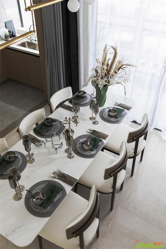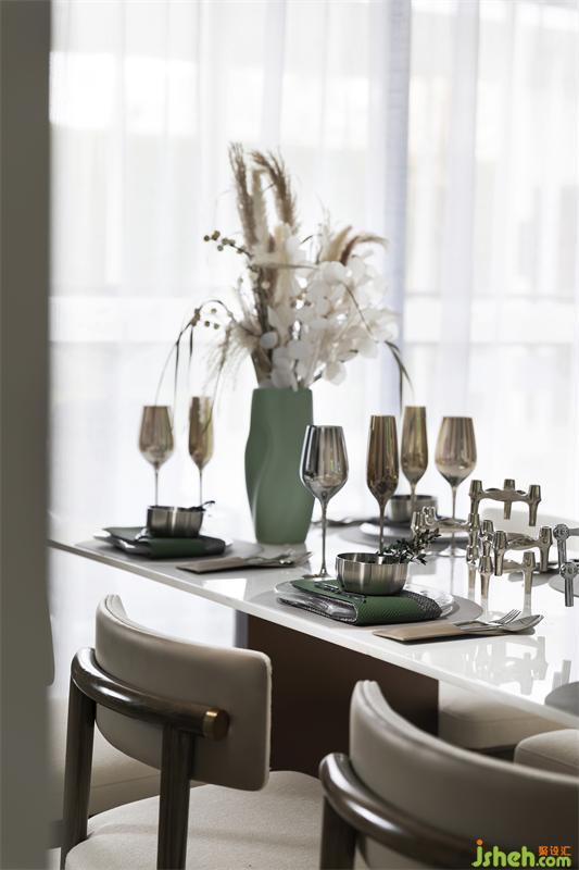 "唯有美食與愛(ài)不可辜負(fù)";餐廳延續(xù)了客廳的詩(shī)情綠意,精致的餐具錯(cuò)落有致,四方餐桌與餐椅方正排列有序,有層次感的椅背搭配白色大理石臺(tái)面的餐桌,花瓶與餐布的綠,不多不少,整個(gè)用餐空間營(yíng)造出自然健康舒適的氛圍。