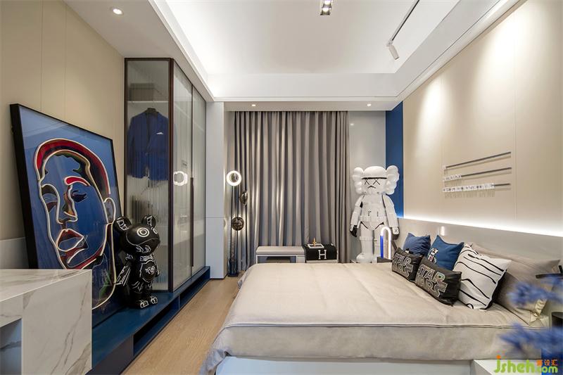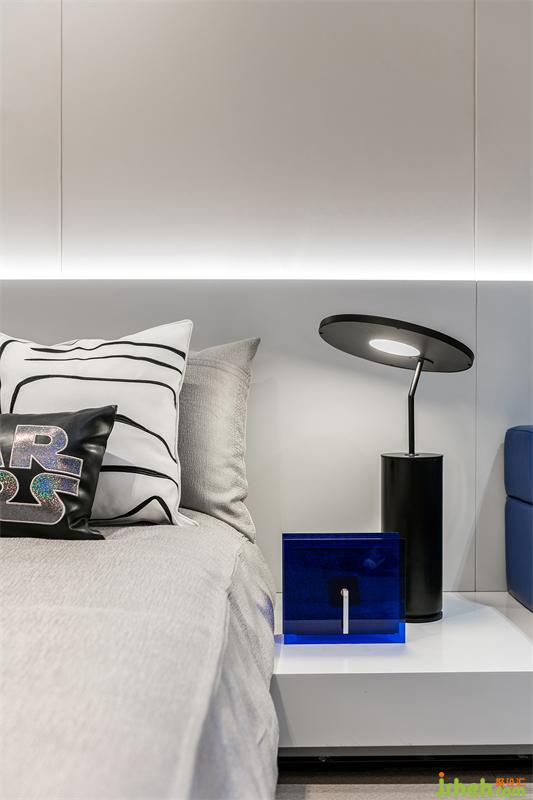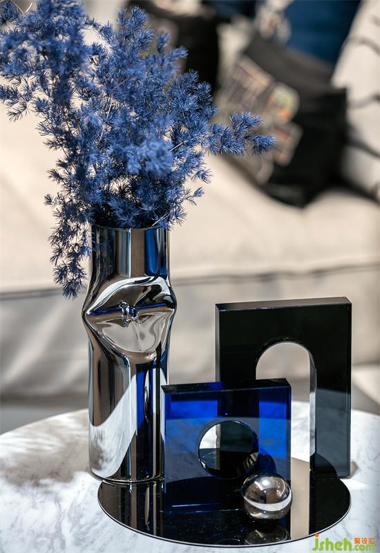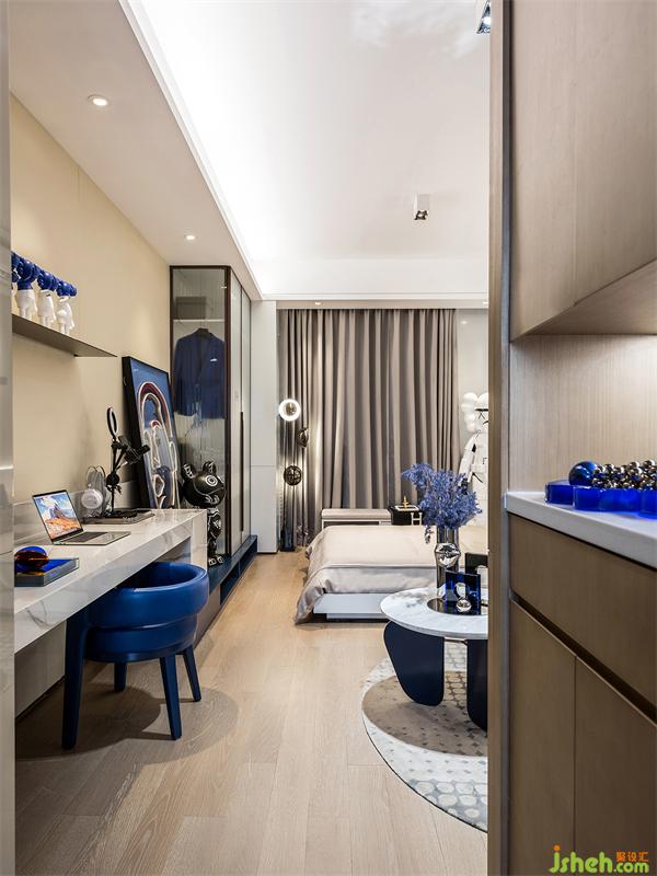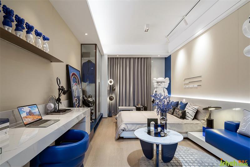 結(jié)合主人公的職業(yè)及愛好,我們將空間引入了極度純凈的克萊因藍。克萊因藍是一種獨特的天青石藍色,兼具群青色的深沉內(nèi)涵,和藍寶色的高貴光澤,能喚起人們最強烈的心靈感受。整個空間兼具時尚潮流和生活溫度的同時,又非常注重居室空間的布局與使用功能的完美結(jié)合。