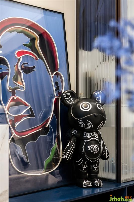 空間整體以灰白皮革硬包加墻布打底,在干凈利索的底色上鋪陳克萊因藍,通過不同大小不同體態(tài)的KAWS玩偶的陳設(shè),讓整個空間充滿了動感。