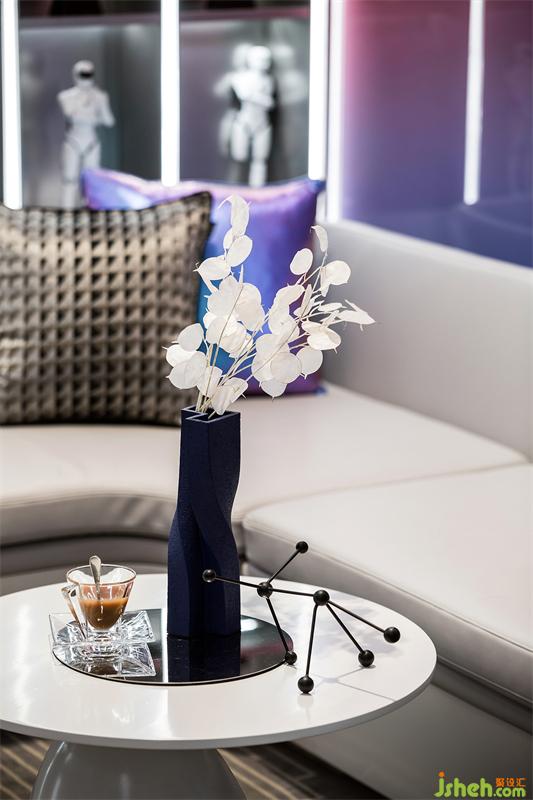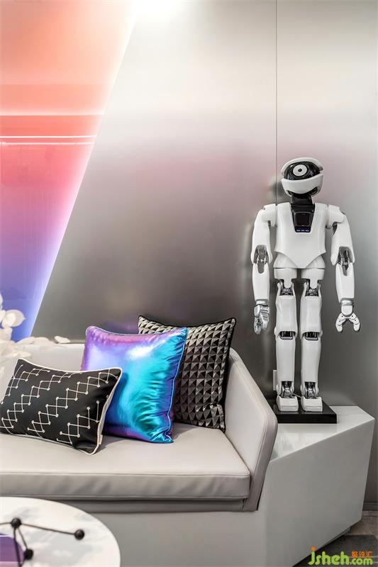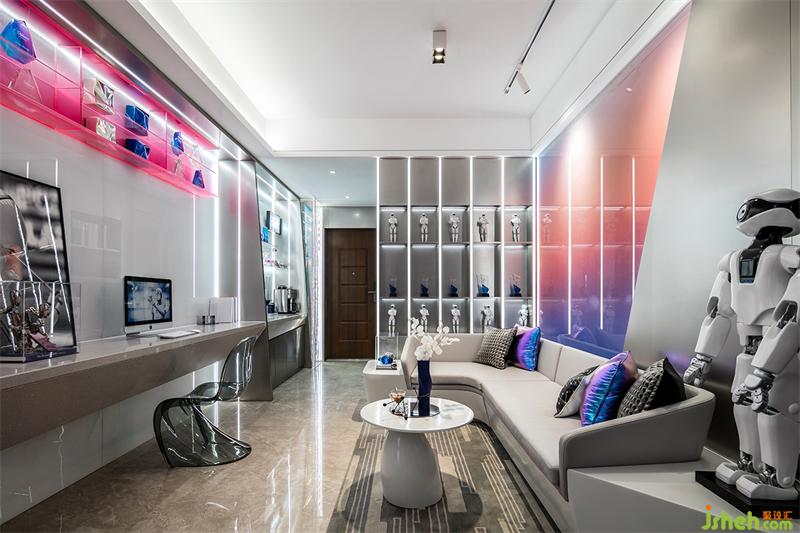工作之余,公寓樣板房設(shè)計(jì)配合LED燈光和音樂氛圍的切換,這里又可以切換成輕松有趣的派對模式。家具器物陳設(shè)以皮質(zhì)、金屬、玻璃鋼、亞克力等材質(zhì)為主??蛷d的科技感沙發(fā),配以科技炫彩的靠枕,給予來訪者一個短暫的休息空間;發(fā)光機(jī)器人雕塑的引入,將工作變成一種精神享受。