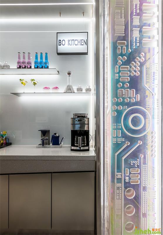 公寓樣板房設(shè)計(jì)整體空間以黑白為基底,配以霓虹粉與鐳射藍(lán),強(qiáng)調(diào)了空間科技感的整體性。入門以超大尺度雞尾酒迷你吧表達(dá)愉悅的工作心態(tài),在科技化和快節(jié)奏高效辦公之余,賦予主人額外的精神享受,亞克力激光雕刻的機(jī)器人時代密碼裝飾墻,仿佛述說著主人每喝一杯都在跟機(jī)器人交流雞尾酒文化。