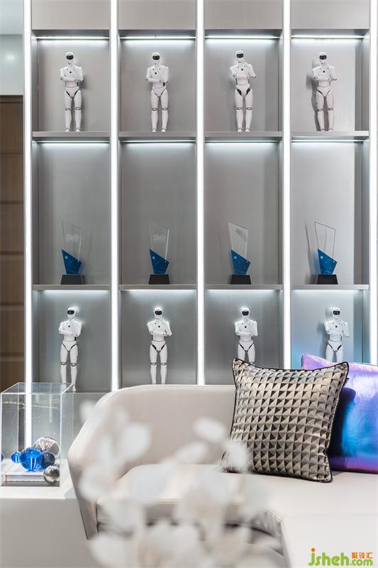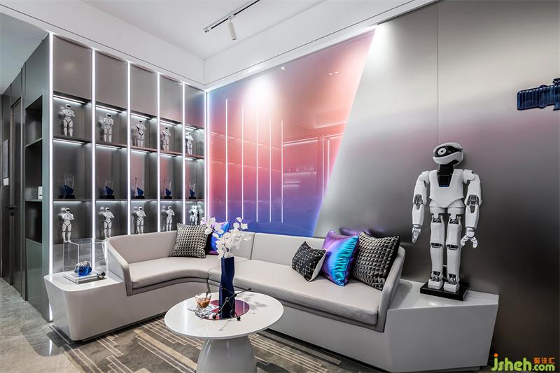 炫彩玻璃的配色,加上燈光,讓辦公室變得科技又個性,映射出我們對于未來的無盡幻想。整面背景墻開放展柜擺放著各種姿勢的小型機(jī)器人,又營造出科技感十足的空間氛圍。