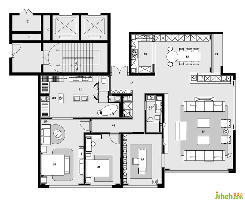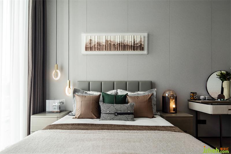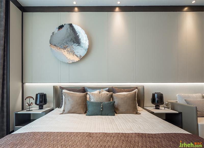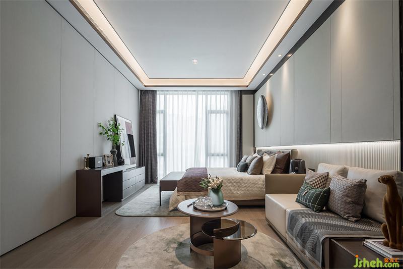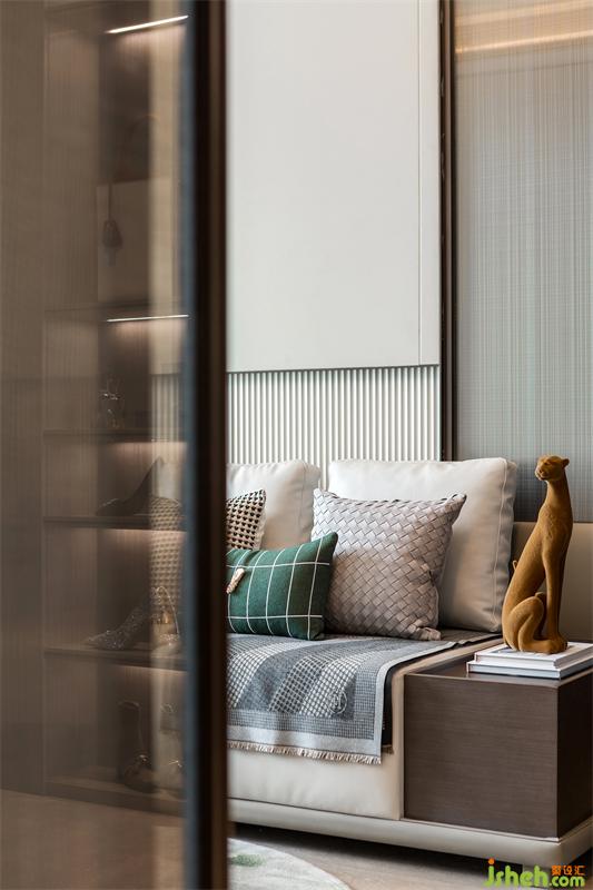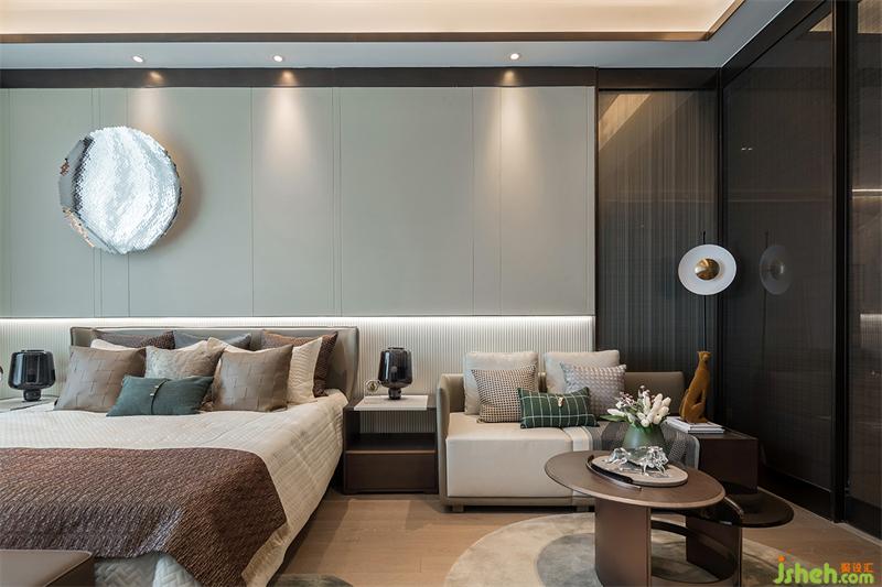 臥室的通道有兩條:一條穿過客廳書房,另一條則是從門廳直接轉(zhuǎn)角到達(dá)。主臥的空間足夠?qū)挸?,我們將其分為會客區(qū)、臥室區(qū)以及開敞式衣帽間和豪華衛(wèi)生間的大套房。整體空間樣板房設(shè)計從圖案色彩到材質(zhì)運(yùn)用皆體現(xiàn)出雅致的意味。男主人睡前在沙發(fā)上瀏覽行業(yè)資訊,打個小盹,翻閱從瑞士帶回來的鐘表畫冊;女主人遞上愛馬仕羊絨毯,溫馨又甜蜜??恐罂堪瑑蓚€人在睡前交流各自的生活心得,偶爾俏皮的打鬧;抑或早晨的陽光透過綿密的紗簾一點(diǎn)點(diǎn)灑進(jìn)來,她欣賞著他熟睡的樣子,親吻他迷人的輪廓......