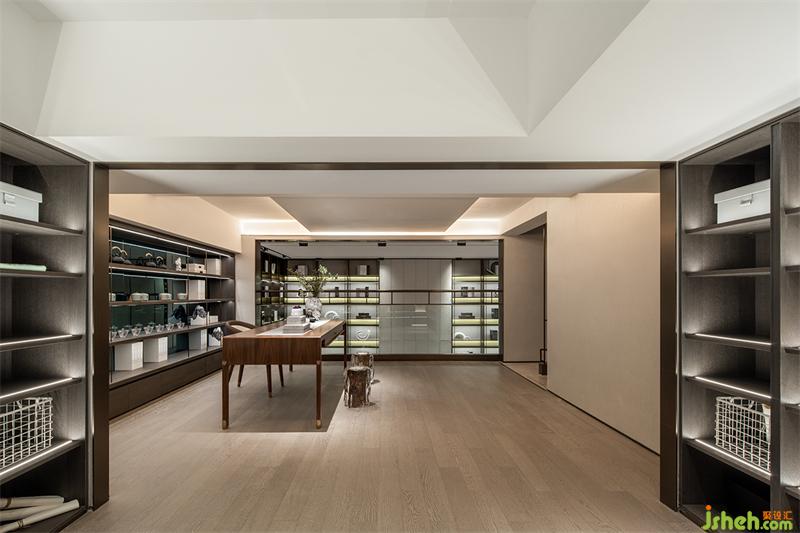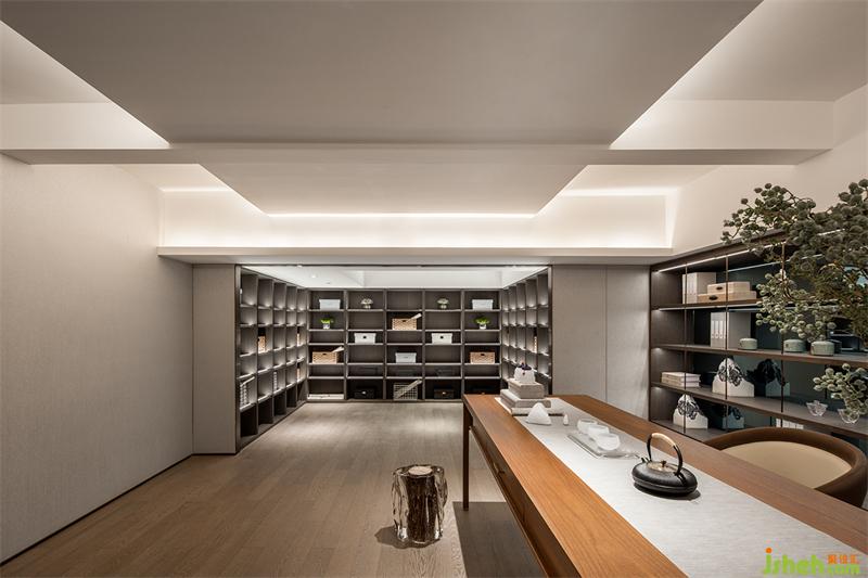 陳羽曾在《茶經(jīng)》里說到喝茶的客數(shù),最適宜數(shù)三數(shù)五,他講“茶性儉,不宜廣,廣則其味淡澹”。茶室的淺色調(diào),配淺木色木地板及木格柵,軟裝則以重色家具和較低的茶臺(tái)調(diào)和空間沉穩(wěn)的調(diào)性。