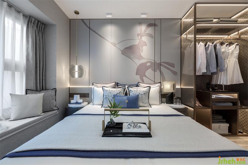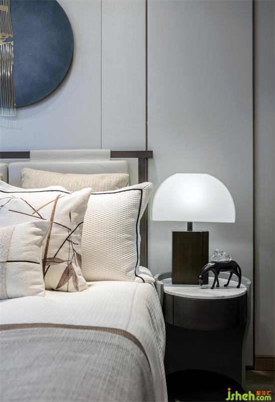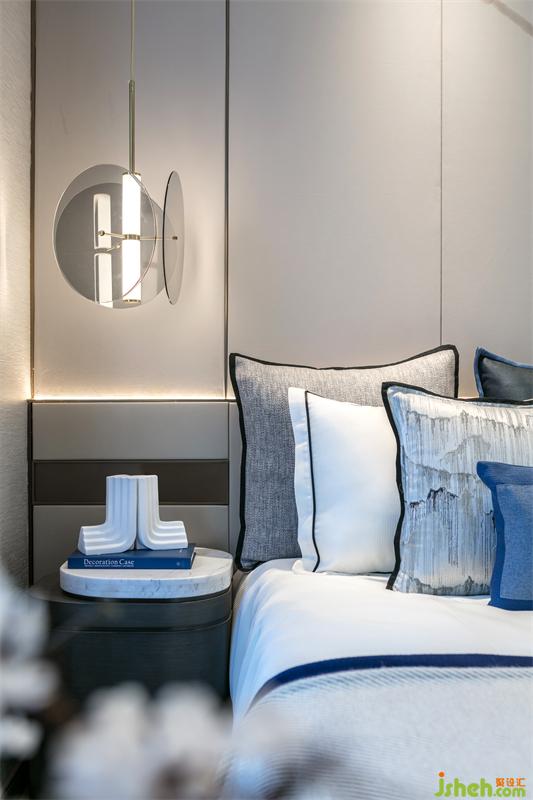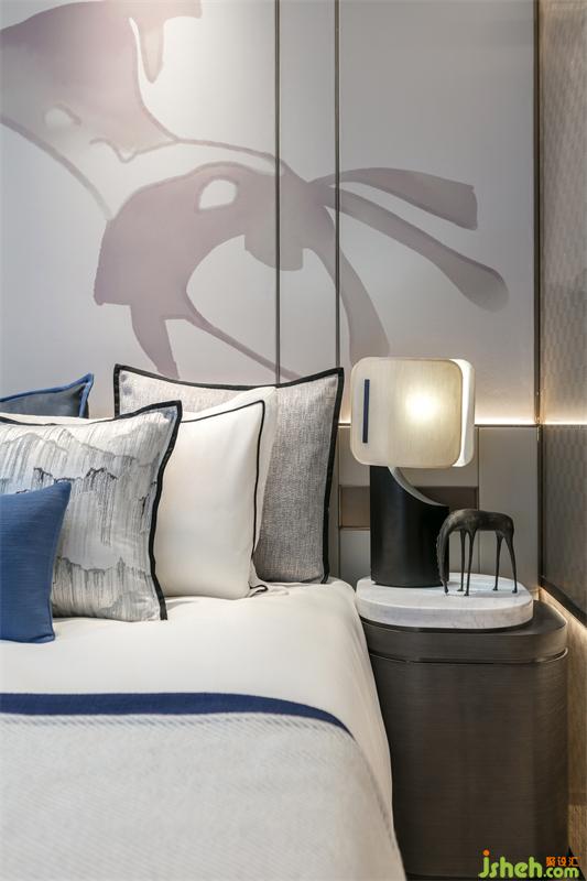 我們從陜西文化中重拾遺韻,于內(nèi)斂細微之處帶給主人親切怡人的地域感受,以富有層次的視覺韻律表達對精致生活的追求。主臥,在功能上集合了臥室,飄窗,衣帽間和主衛(wèi)的四件套。素雅精巧的家具陳設和的淡墨輕嵐的手繪畫卷營造出溫暖柔和的空間氣韻,在這里,中西元素自然相融,時而像一位淡泊明志的隱士,時而又化作一個鮮衣怒馬的少年。暖灰的理性,克制,胡桃木的溫潤,恬淡,香檳金的典雅,與藍色碰撞,賦予空間一絲華貴的氣息。