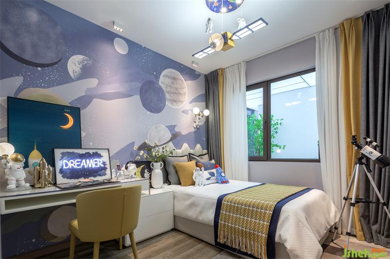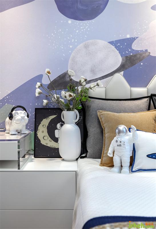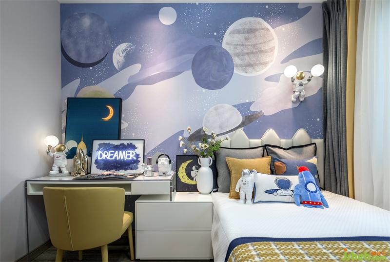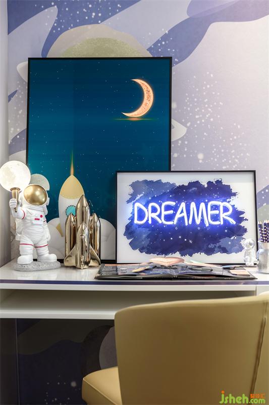 每個(gè)小男孩都有一個(gè)開飛船的夢(mèng)想,帶上自己的畫筆,乘著歌聲的翅膀,穿越太空去看看月球上是否有迷路的宇航員……黃藍(lán)色系的男孩房充滿太空的氣息,飛船模型吊燈,閃閃發(fā)亮的霓虹夢(mèng)想畫,若隱若現(xiàn)的月亮燈,宇宙星球立體書,在自拍的宇航員等,整個(gè)空間的軟裝都充滿了動(dòng)感,讓孩子們瞬間穿越,隨時(shí)飛向遙遠(yuǎn)的太空,去實(shí)現(xiàn)“長(zhǎng)大我要開飛船”的夢(mèng)想。