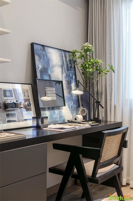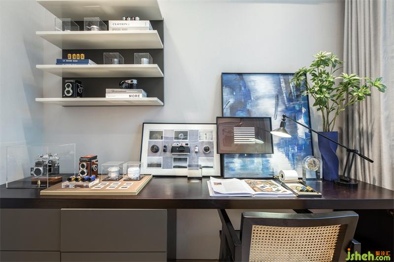 攝影主題的書房打破常規(guī)的擺放方式,以工作室的形式展現(xiàn),既豐富了空間的動(dòng)線,又釋放了空間的尺度??鋸堄诸B皮的達(dá)利攝影作品和雕塑擺件,銅川樣板房設(shè)計(jì)仿佛在闡述東西方的藝術(shù)交流形式,東方的摩登與西方的開放,有種豁然開朗的戲劇張力。